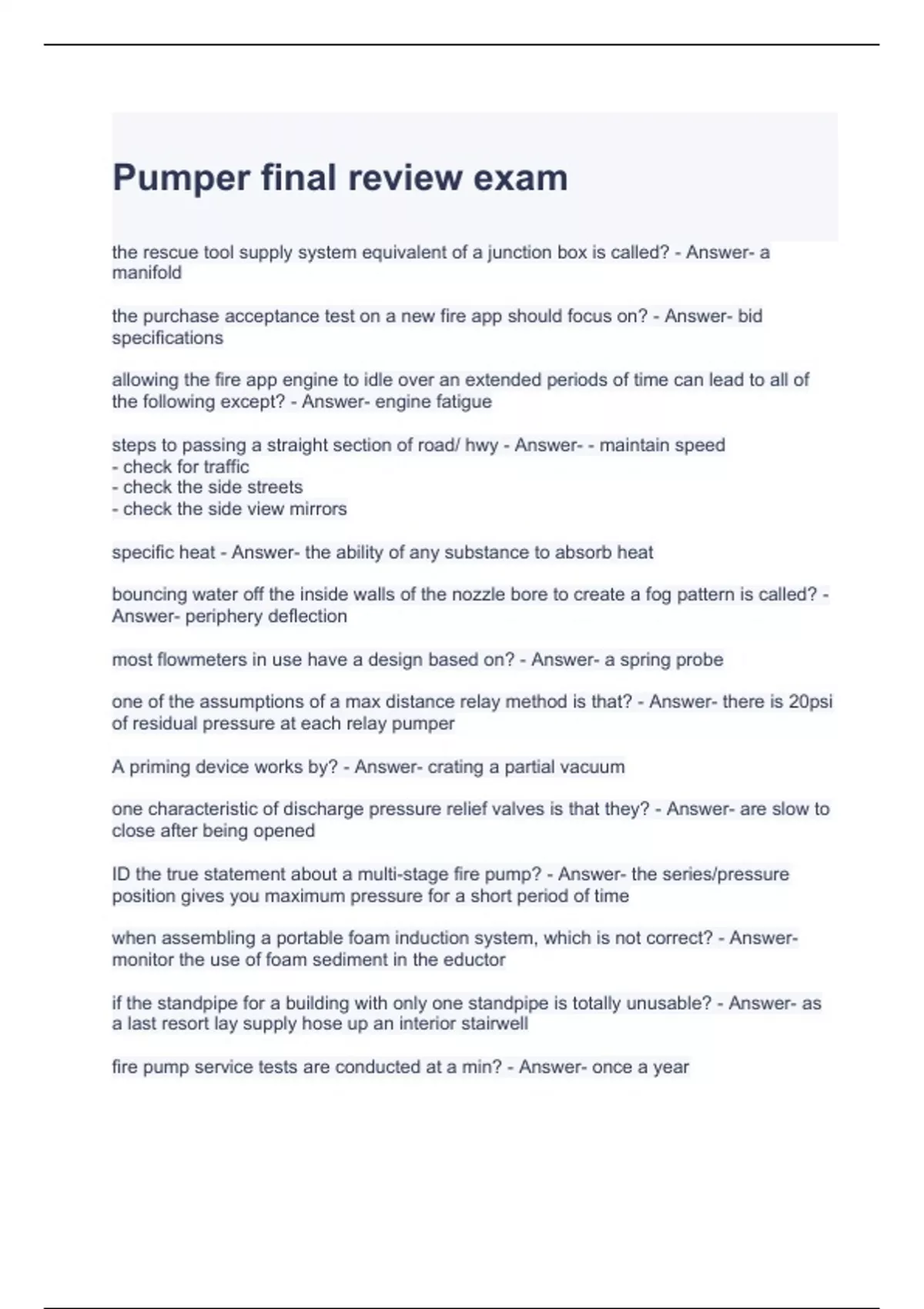 Pumper final review exam with complete solutions