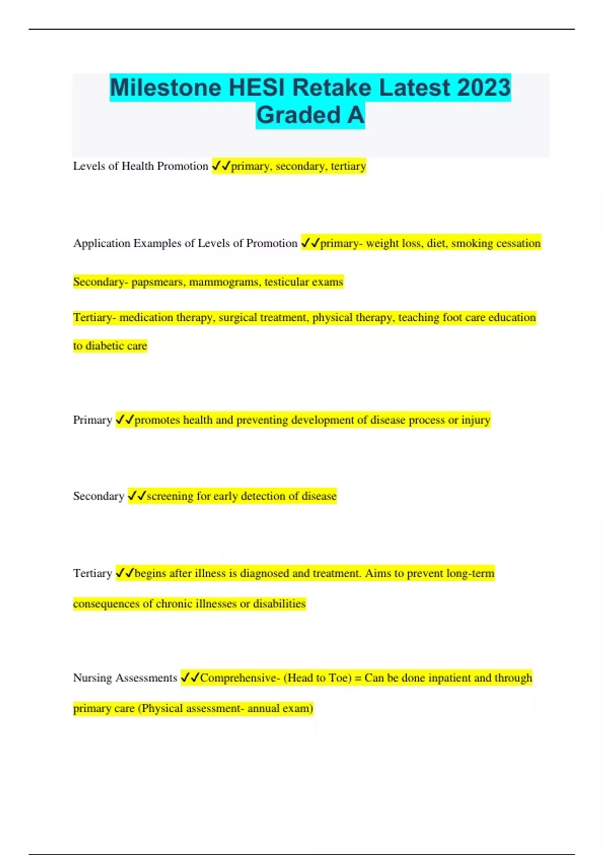 Milestone HESI Retake Latest 2023 Graded A Levels of Health Promotion primary, secondary, tertiary Application Examples of Levels of Promotion primary- weight loss, diet, smoking cessation Secondary- papsmears, mammograms, testicular exams Tertiary- medication therapy, surgical treatment, physical therapy, teaching foot care education to diabetic care Primary promotes health and preventing development of disease process or injury Secondary screening for early detection of disease Tertiary begins after illness is diagnosed and treatment. Aims to prevent long-term consequences of chronic illnesses or disabilities Nursing Assessments Comprehensive- (Head to Toe) = Can be done inpatient and through primary care (Physical assessment- annual exam) Focused- Health and physical hx of specific problem.- ex. Sick visit Emergency- crisis, life threatening. ex. airway, breathing, injury, disability, exposure, med reconciliation Phases of Interview process Pre-interaction, beginning, working (open and close ended questions), closing Data sources Primary- individual patient Secondary- chart info, family members Purposes of Documentation verbal communication, SBAR, written document Lifespan Nutritional Considerations - Nutrition: Pregnant Women need additional 300-500 cal/day (whole foods Lifespan Nutritional Considerations - Nutrition: infants/children infants/children: whole milk for ages 2-5 fat intake-brain development Lifespan Nutritional Considerations - Nutrition: Older BMR declines, Vitamin D supplements, Problems: decreased thirst, increase risk for osteoarthritis, osteoporosis, dementia, obesity, social isolation General Survey mental note of overall health (hygiene/appearance). Assessing pain: documentation, OLDCARTS/OPQRST. Aggravating and alleviating factors, pain goal and funtional goal Assessing Pain - Documentation Acute vs. Chronic-Location Priority Priority pain: stones (kidney, gallbladder, calcium and/or struvite), myocardial infarcation (HA), burns and sickle cell Heart Rate Elevated above 100 beats per minute Blood Pressure- Normal above systolic- 120-129, diastolic- less than 80, Blood Pressure- elevated Hypertension: Stage 1: 130-139 or 80-89, Stage Hypertension 2: more than 140, or greater than or equal to 90 When should BP be taken? after patient rests for 5 minutues or 30 minutes after caffeine, smoking Assessment of the Head and Neck Inspect, palpate, auscultate Infection If nodes are palpable, warm, tender = infection Assessment of the Ear - Techniques Adults: up and back Children: down and back Assessment of the Ear - Techniques Part 2 observe behavioral responses to speech, inspect ear formation (size, shape & any malformation to the auricle, condition) Perform whisper test & Rinne test. Pt plug one ear at a time Perform weber test (evaluate unilateral hearing loss Assessing the Chest inspect, palpate, percuss, auscultate Assessing Lung Sounds - Technique IPPA- inspect, palpate, percuss, auscultate Normal Lung Sounds Normal: bronchial (heard anteriorly) over larynx and trachea (INSPIRIATION slightly shorter than expiration), Bronchiovesicular (heard anteriorly and posteriorly)INSPIRATION AND EXPIRATION EQUAL , Vesicular (heard both) lower lungs, low pitch, INSPIRATION GREATER THAN EXPIRATION) Abnormal lung sounds: Rhonchi low- heard mainly in expiration when pt is breathing out (made up of one sound- whistle or whine and high pitch, musical instrument sound MULTIPLE sounds- mainly heard in expiration CONDITION: PNEUMONIA abnormal lung sounds: stridor airway obstruction, high pitch whispering or gas (CROUP, EMERGENCY, EPIGLOTTIS) Abnormal lung sounds: Crackles coarse(low pitch, wet sound) fine (high pitch, doesnt clear w/cough, crackling of fire sound) CONDITION:RESPIRATORY EDEMA/OBSTRUCTIVE DISEASE Abnormal lung sounds: Pleural Friction Rub Pleural friction rub (low pitch, harsh grating sound) Assessment of the Respiratory System tachypnea- rapid breathing bradypnea- slow breathing Normally, respirations are quiet and nonlabored, and occur at a rate of 12 to 20 times each minute in healthy adults. Note any flaring of the nostrils, muscular retractions, Heart Function System Abnormal size or location of the PMI or the presence of vibrations can indicate heart failure, myocardial infarction, disease of the heart valves, or other cardiac diseases. Abdominal Assessment Inspect, auscultate, percussion, and palpate. Nurse assess lumps, masses or tenderness Musculoskeletal System - Pronation & Supination prone- plank (face downward), supine- on the back, Disorder: osteoporosis- break down of bone (weight bearing activity is encouraged) Secondary osteoporosis- steroids' aka bones porous and bone prone to fractures Compression fracture- changing position slowly, tenderness of palpitation of spine, in pain Neuro Assessment- Cranial Nerves Olfactory (smell),Cranial Nerve 2: optic, cranial nerve 3: oculomotor, cranial nerve 4: Trochlear, cranial nerve 5: Trigeminal nerve, Cranial nerve 6: abducens cranial nerve 7: facial nerve cranial nerve 8: acoustic, cranial nerve 9: Glossopharyngeal cranial nerve 10: vagus cranial nerve 11: accessory cranial nerve 12: hypoglossal Full Description (Cranial Nerve 1: Olfactory (smell),Cranial Nerve 2: confrontational field (cover up eye in fields in all fields) and visual acuity (Snellen Chart) reading at 20 feet from the chart . Cranial Nerve III: oculomotor- nystagmus- moving penlight in 6 cardinal fields of gaze, Cranial nerve IV: Trochlear: assess pupil constriction (normal: 3-5 mm), PERRLA and Cranial nerve VI: Abducens , Cranial nerve 5: Trigeminal nerve- mastification (feel temporal and masseter muscle)open and close mouth against resistance, cranial nerve 7: facial nerve (open and close eyes, frown, smile, Cranial nerve 8: occlude ears and whisper word and pt repeat, Cranial nerve 9: Glossopharyngeal-test gag reflex, vagus nerve- pt able to speak and swallow, cranial nerve 11- accessory- shrug shoulders w/ease, Hypoglossal: pt moves tongue f