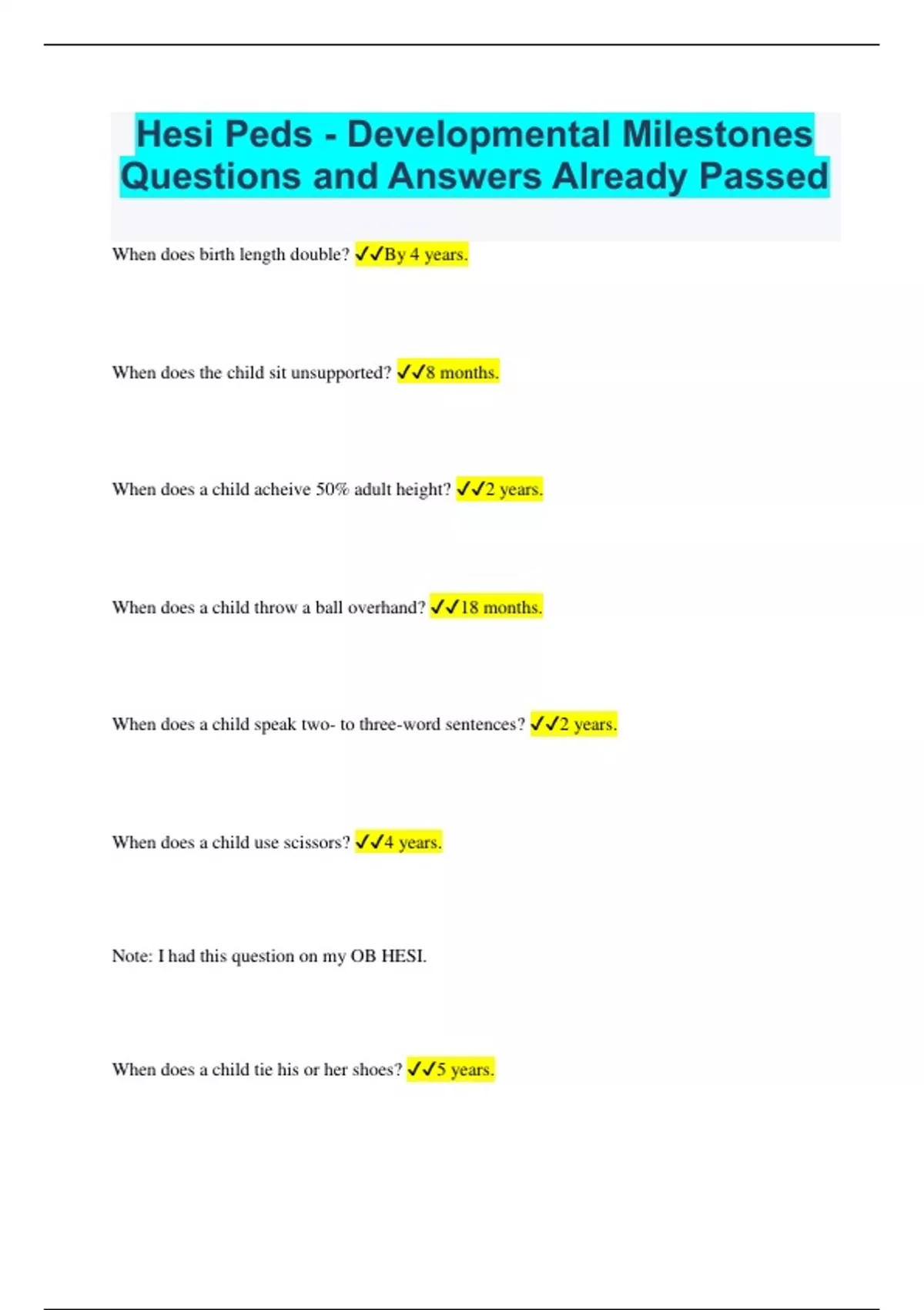 Hesi Peds - Developmental Milestones Questions and Answers Already Passed