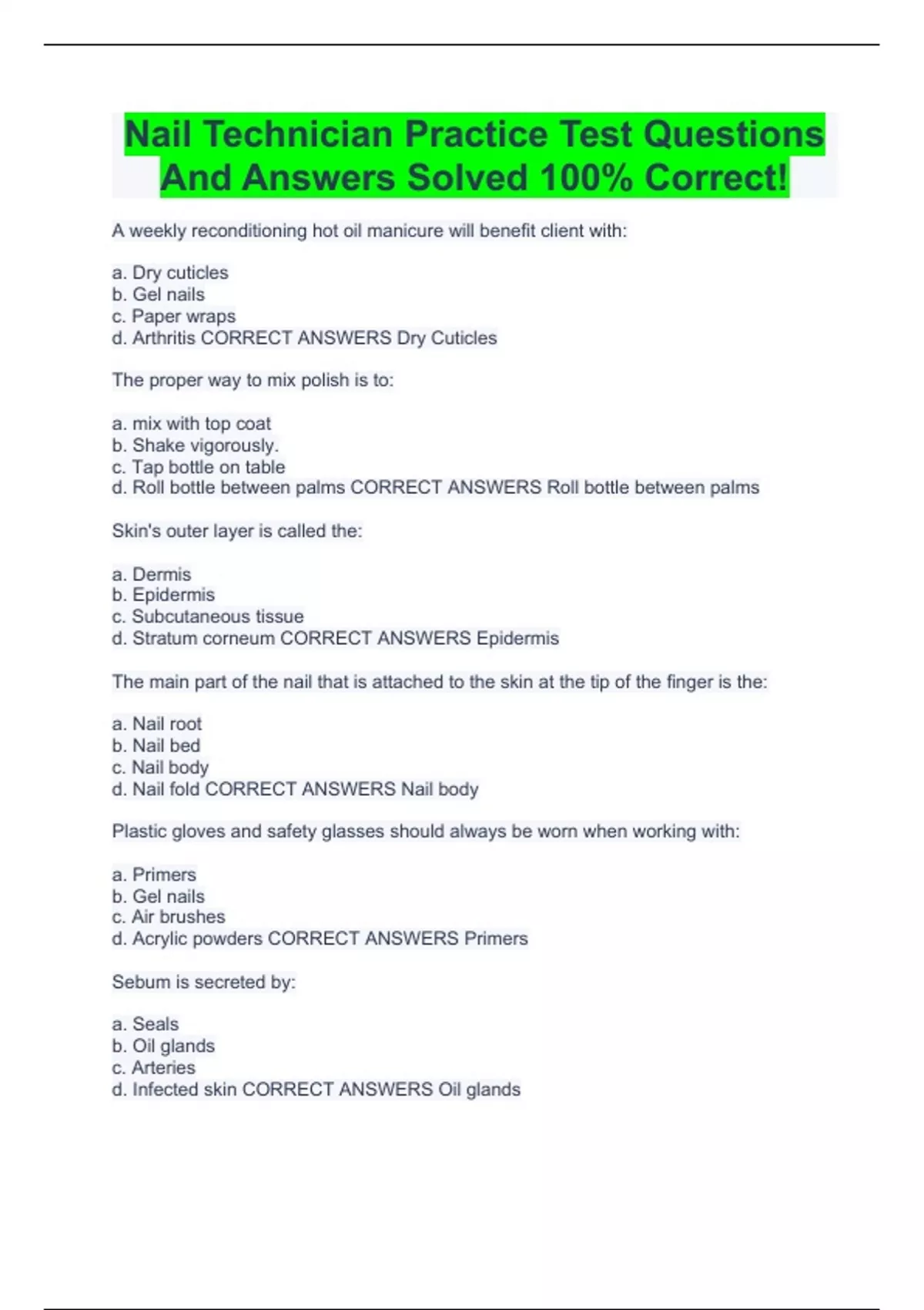 Nail Technician Practice Test Questions And Answers Solved 100% Correct!