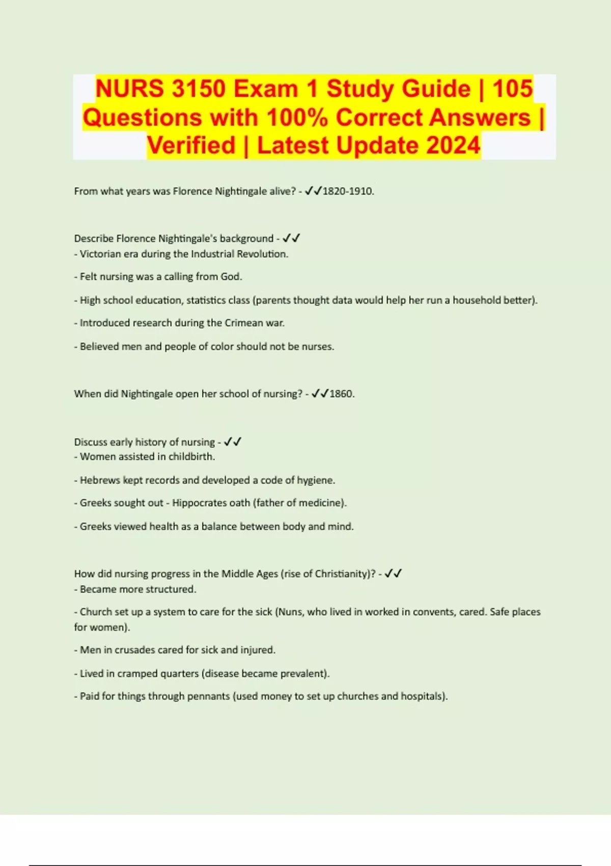 From what years was Florence Nightingale alive? - . Describe Florence Nightingale's background - - Victorian era during the Industrial Revolution. - Felt nursing was a calling from God. - High school education, statistics class (parents thought data would help her run a household better). - Introduced research during the Crimean war. - Believed men and people of color should not be nurses. When did Nightingale open her school of nursing? - 1860. Discuss early history of nursing - - Women assisted in childbirth. - Hebrews kept records and developed a code of hygiene. - Greeks sought out - Hippocrates oath (father of medicine). - Greeks viewed health as a balance between body and mind. How did nursing progress in the Middle Ages (rise of Christianity)? - - Became more structured. - Church set up a system to care for the sick (Nuns, who lived in worked in convents, cared. Safe places for women). - Men in crusades cared for sick and injured. - Lived in cramped quarters (disease became prevalent). - Paid for things through pennants (used money to set up churches and hospitals)