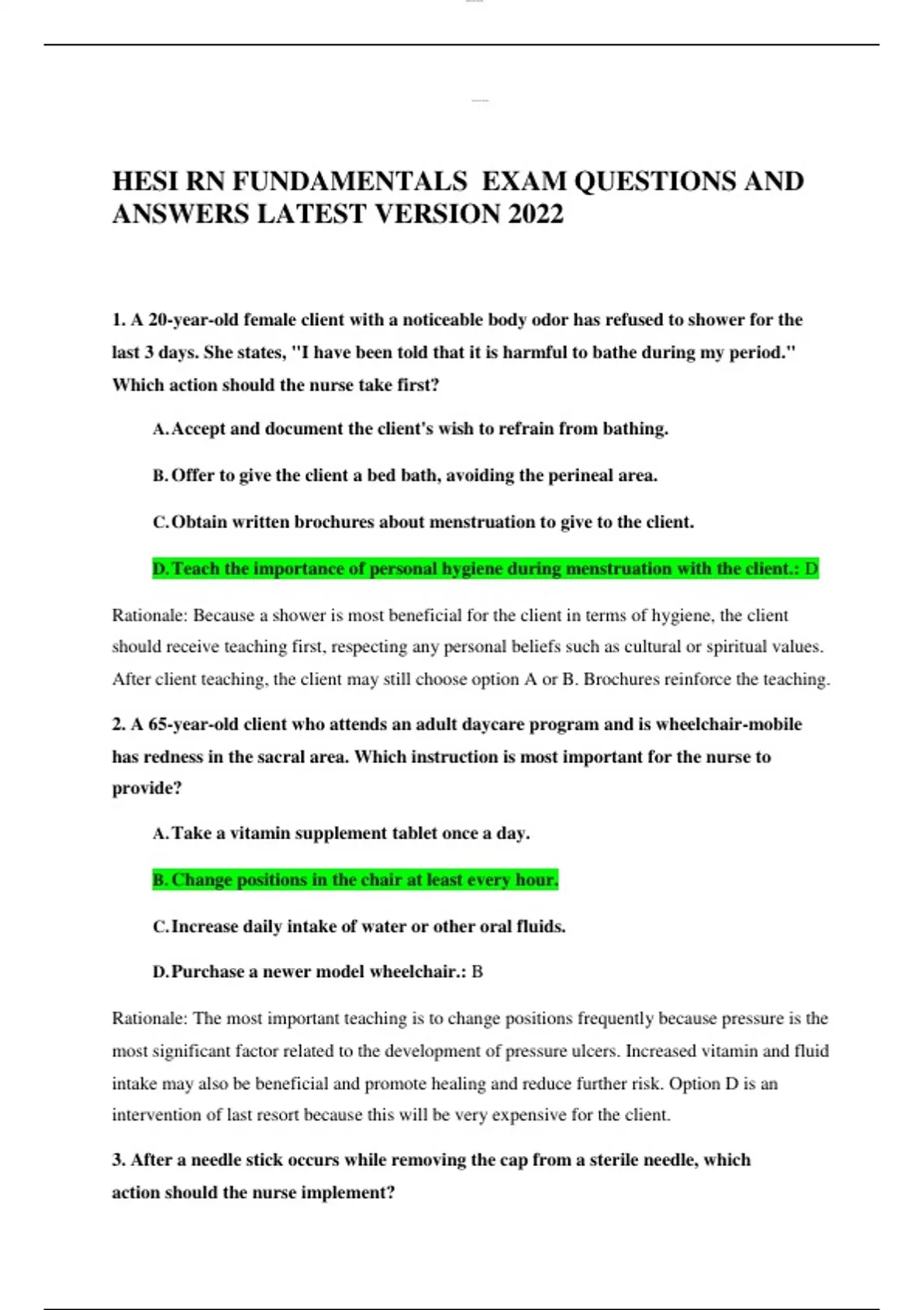 HESI RN FUNDAMENTALS EXAM QUESTIONS AND ANSWERS LATEST VERSION 2022 1. A 20-year-old female client with a noticeable body odor has refused to shower for the last 3 days. She states, "I have been told that it is harmful to bathe during my period." Which action should the nurse take first? A.Accept and document the client's wish to refrain from bathing. B.Offer to give the client a bed bath, avoiding the perineal area. C.Obtain written brochures about menstruation to give to the client. D.Teach the importance of personal hygiene during menstruation with the client.: D Rationale: Because a shower is most beneficial for the client in terms of hygiene, the client should receive teaching first, respecting any personal beliefs such as cultural or spiritual values. After client teaching, the client may still choose option A or B. Brochures reinforce the teaching. 2. A 65-year-old client who attends an adult daycare program and is wheelchair-mobile has redness in the sacral area. Which instruction is most important for the nurse to provide? A.Take a vitamin supplement tablet once a day. B. Change positions in the chair at least every hour. C.Increase daily intake of water or other oral fluids. D.Purchase a newer model wheelchair.: B Rationale: The most important teaching is to change positions frequently because pressure is the most significant factor related to the development of pressure ulcers. Increased vitamin and fluid intake may also be beneficial and promote healing and reduce further risk. Option D is an intervention of last resort because this will be very expensive for the client. 3. After a needle stick occurs while removing the cap from a sterile needle, which action should the nurse implement? lOMoAR cPSD| 1Complete an incident report. A.Select another sterile needle. B. Disinfect the needle with an alcohol swab. C.Notify the supervisor of the department immediately.: B Rationale: After a needle stick, the needle is considered used, so the nurse should discard it and select another needle. Because the needle was sterile when the nurse was stuck and the needle was not in contact with any other person's body fluids, the nurse does not need to complete an incident report or notify the occupational health nurse. Disinfecting a needle with an alcohol swab is not in accordance with standards for safe practice and infection control. 4. After receiving written and verbal instructions from a clinic nurse about a newly prescribed medication, a client asks the nurse what to do if questions arise about the medication after getting home. How should the nurse respond? A.Provide the client with a list of Internet sites that answer frequently askedquestions about medications. B.Advise the client to obtain a current edition of a drug reference book from alocal bookstore or library. C.Reassure the client that information about the medication is included in thewritten instructions. D.Encourage the client to call the clinic nurse or health care provider if anyquestions arise.: D Rationale: To ensure safe medication use, the nurse should encourage the client to call the nurse or health care provider if any questions arise. Options A, B, and C may all include useful information, but these sources of information cannot evaluate the nature of the client's questions and the follow-up needed. 5. After the nurse tells an older client that an IV line needs to be inserted, the client becomes very apprehensive, loudly verbalizing a dislike for all health care providers and nurses. How should the nurse respond? lOMoAR cPSD| A.Ask the client to remain quiet so the procedure can be performed safely. B.Concentrate on completing the insertion as efficiently as possible. C.Calmly reassure the client that the discomfort will be temporary. D.Tell the client a joke as a means of distraction from the procedure.: C Rationale: The nurse should respond with a calm demeanor to help reduce the client's apprehension. After responding calmly to the client's apprehension, the nurse may implement to ensure safe completion of the procedure