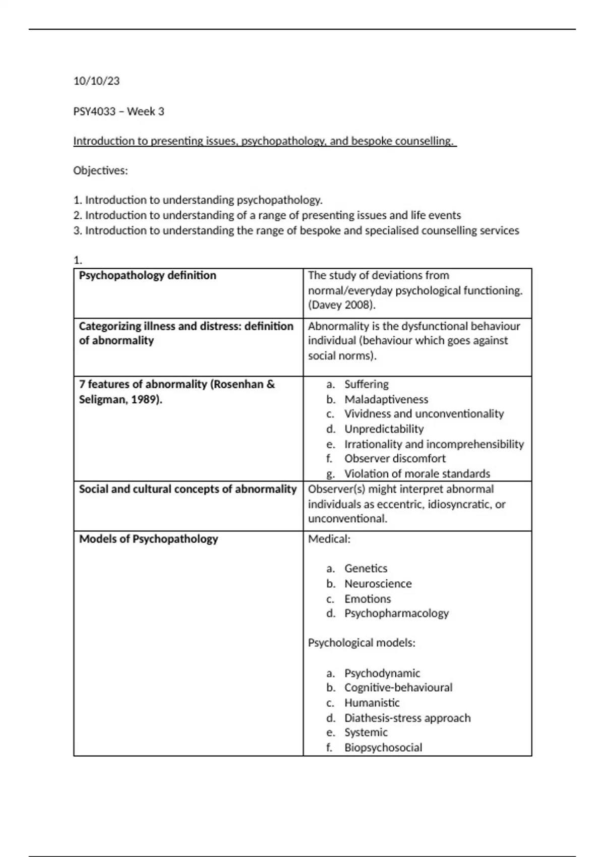 These notes contain an explanation of the introduction to presenting issues, psychopathology, and bespoke counselling.