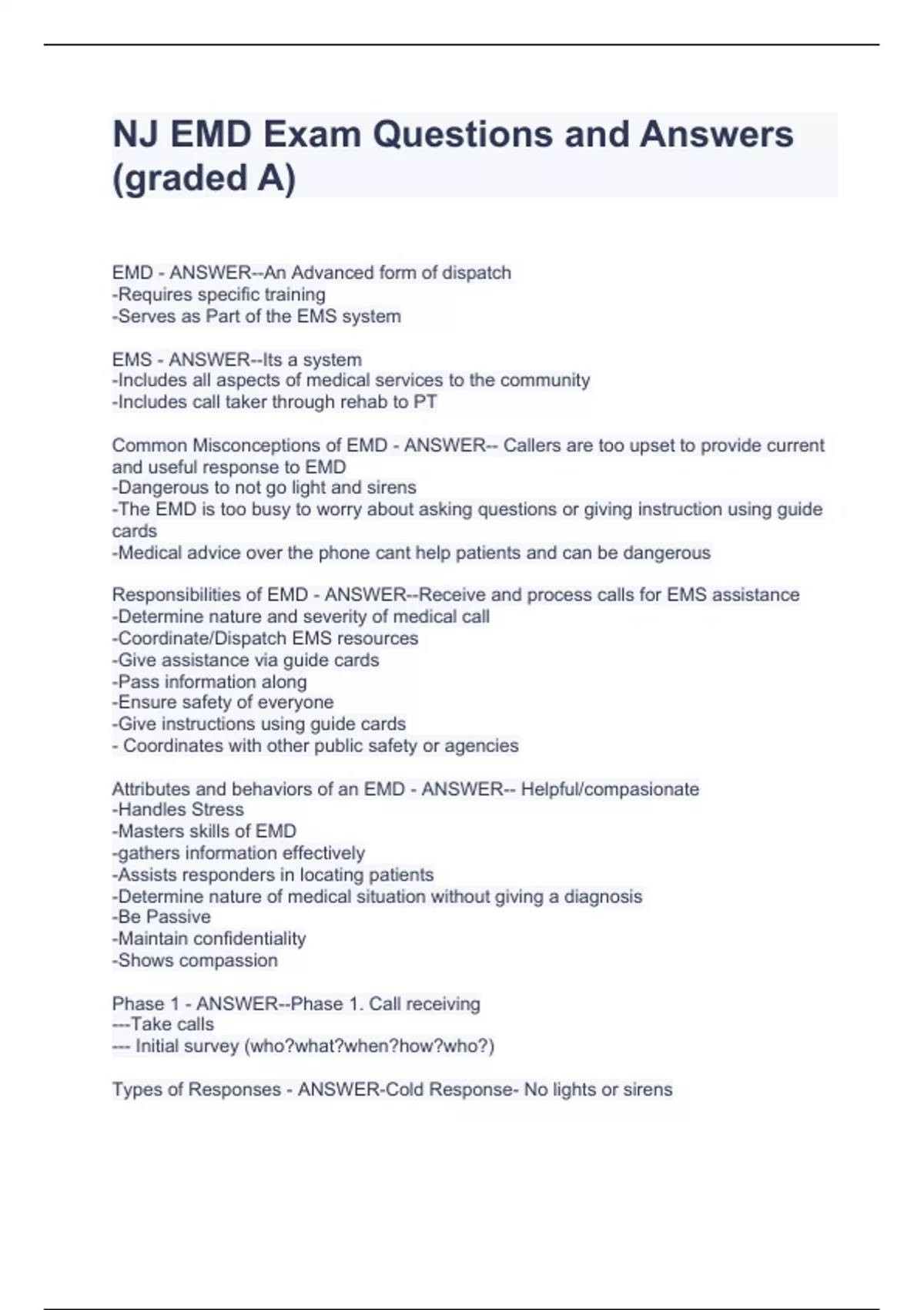 NJ EMD Exam Questions and Answers (graded A) NJ EMD Exam Questions and Answers (graded A) NJ EMD Exam Questions and Answers (graded A) EMD - ANSWER--An Advanced form of dispatch -Requires specific training -Serves as Part of the EMS system EMS - ANSWER--Its a system -Includes all aspects of medical services to the community -Includes call taker through rehab to PT Common Misconceptions of EMD - ANSWER-- Callers are too upset to provide current and useful response to EMD -Dangerous to not go light and sirens -The EMD is too busy to worry about asking questions or giving instruction using guide cards -Medical advice over the phone cant help patients and can be dangerous Responsibilities of EMD - ANSWER--Receive and process calls for EMS assistance -Determine nature and severity of medical call -Coordinate/Dispatch EMS resources -Give assistance via guide cards -Pass information along -Ensure safety of everyone -Give instructions using guide cards - Coordinates with other public safety or agencies