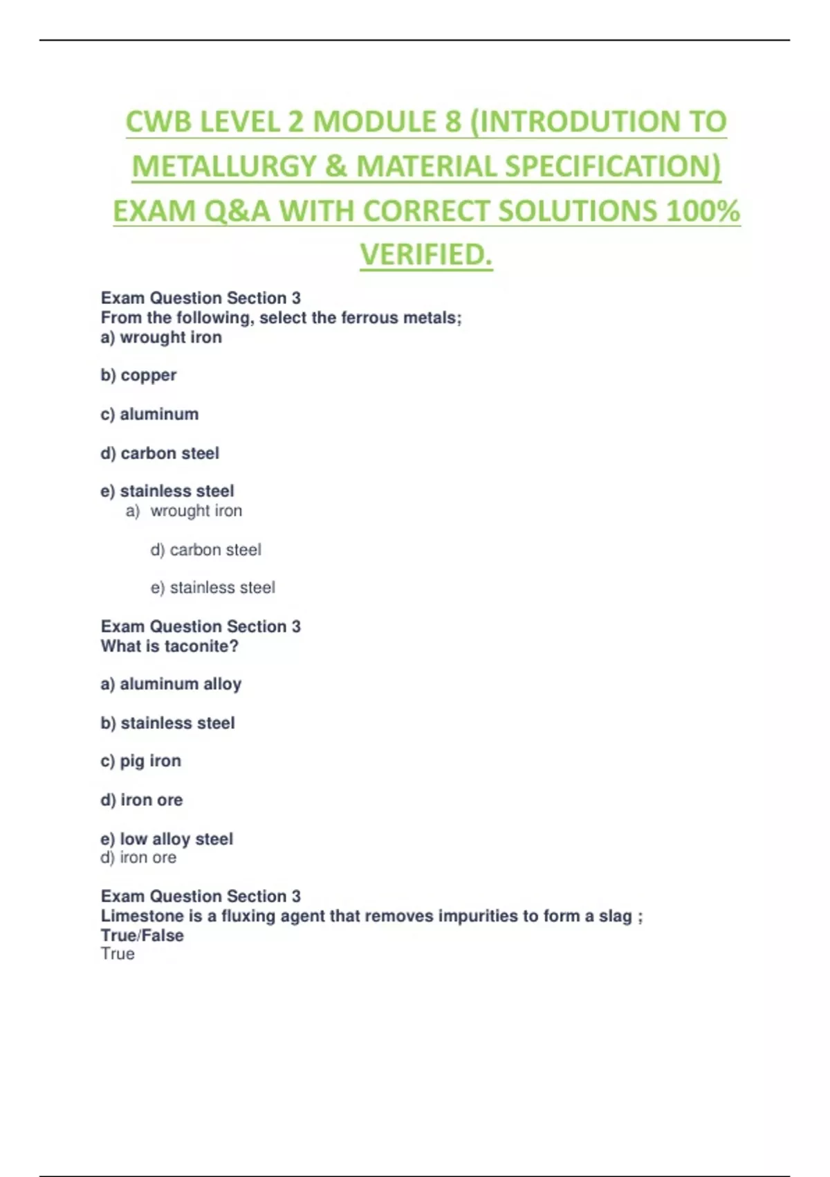 CWB LEVEL 2 MODULE 8 (INTRODUTION TO METALLURGY & MATERIAL SPECIFICATION) EXAM Q&A WITH CORRECT SOLUTIONS 100% VERIFIED.
