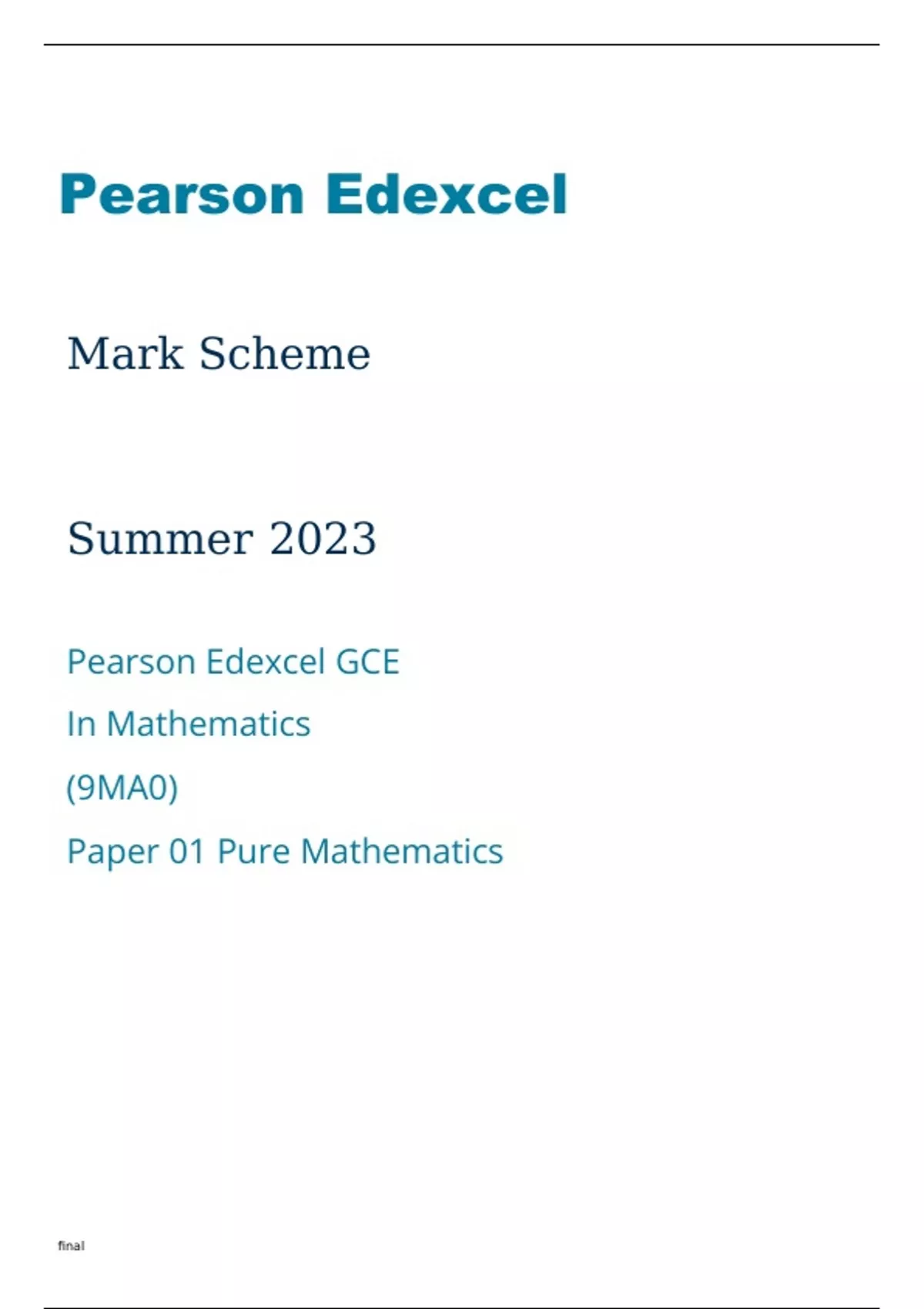 Edexcel Mathematics 9MA0/01 Question Paper and Mark Scheme June2023.