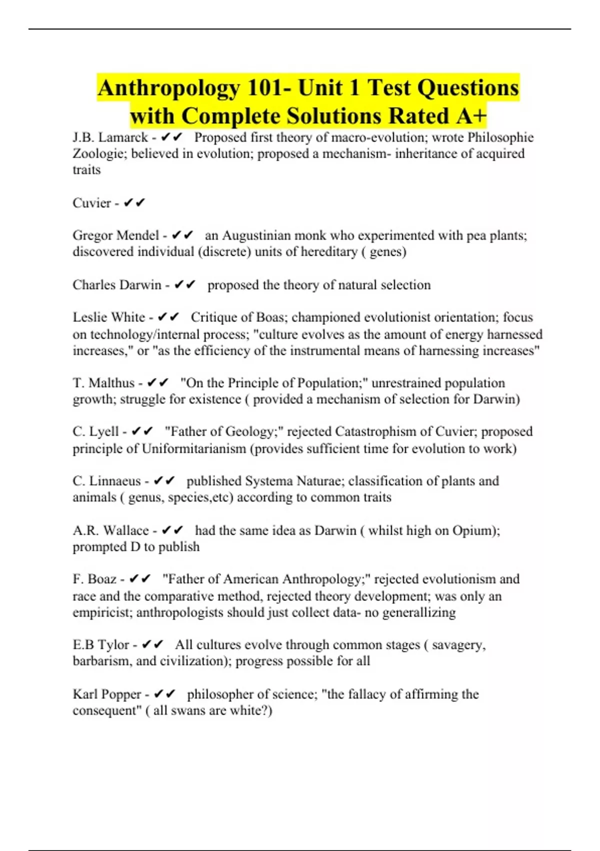 Anthropology 101- Unit 1 Test Questions with Complete Solutions Rated A+