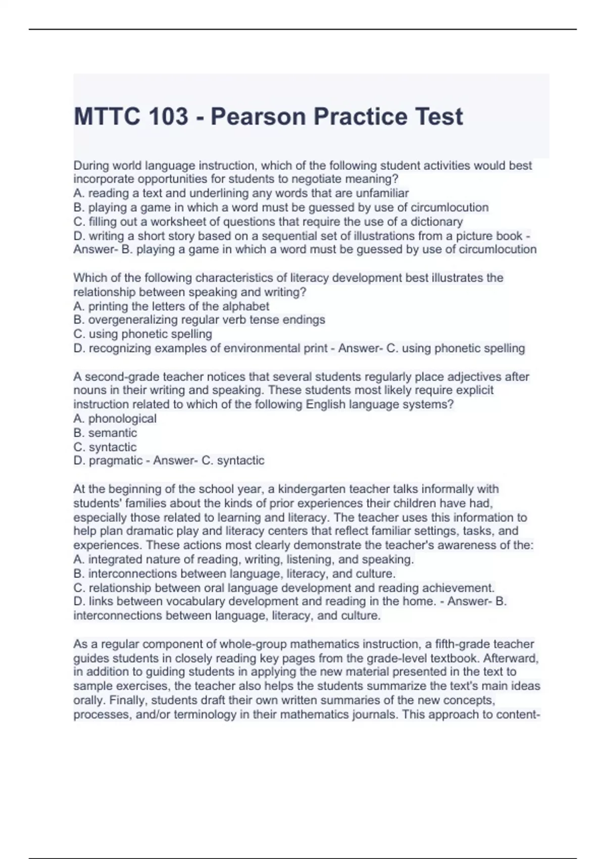 MTTC 103 - Pearson Practice Test Questions and Answers