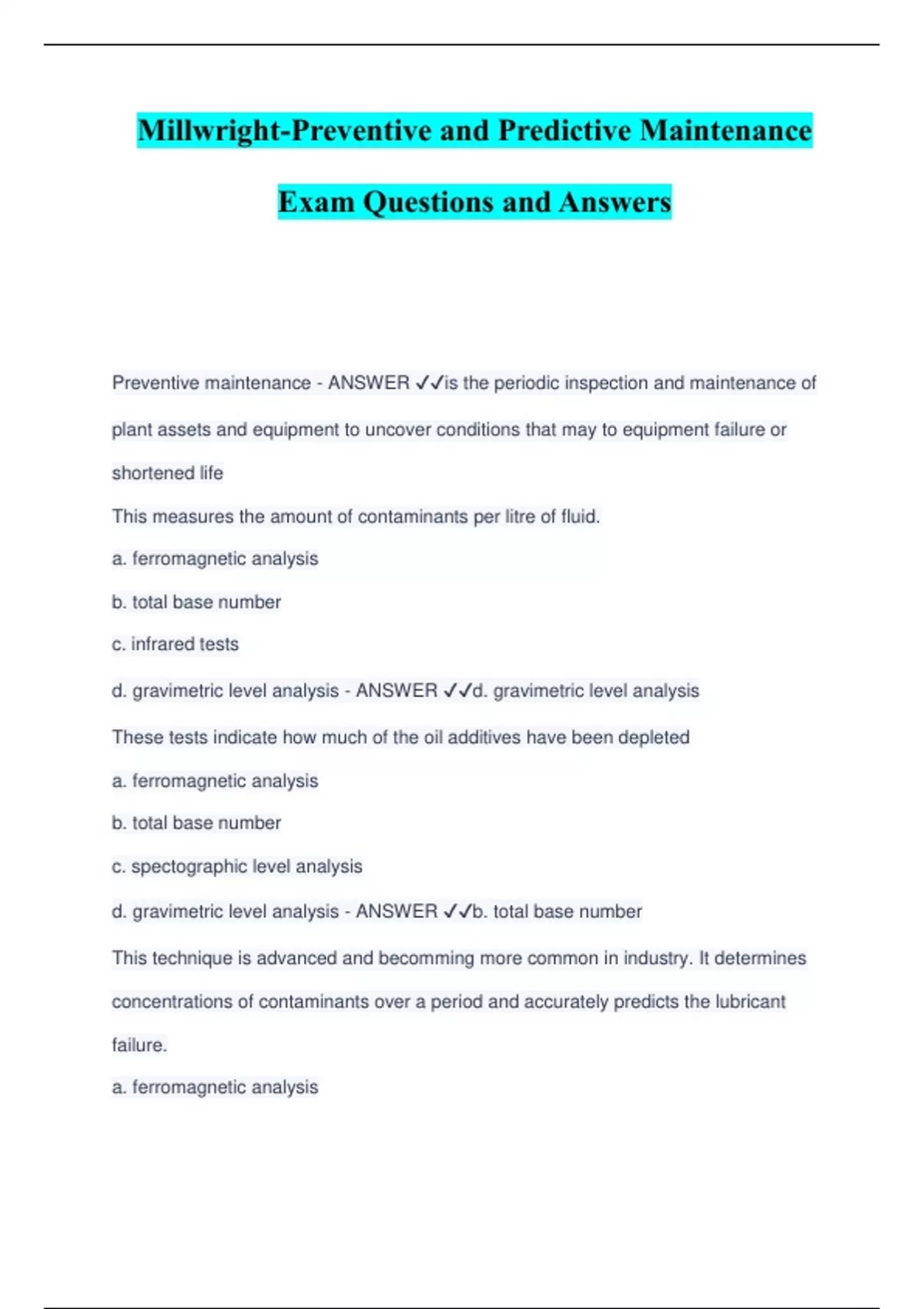 Millwright-Preventive and Predictive Maintenance Exam Questions and Answers Preventive maintenance - ANSWER ️️ is the periodic inspection and maintenance of plant assets and equipment to uncover conditions that may to equipment failure or shortened life This measures the amount of contaminants per litre of fluid. a. ferromagnetic analysis b. total base number c. infrared tests d. gravimetric level analysis - ANSWER ️️ d. gravimetric level analysis These tests indicate how much of the oil additives have been depleted a. ferromagnetic analysis b. total base number c. spectographic level analysis d. gravimetric level analysis - ANSWER ️️ b. total base number This technique is advanced and becomming more common in industry. It determines concentrations of contaminants over a period and accurately predicts the lubricant failure. a. ferromagnetic analysis