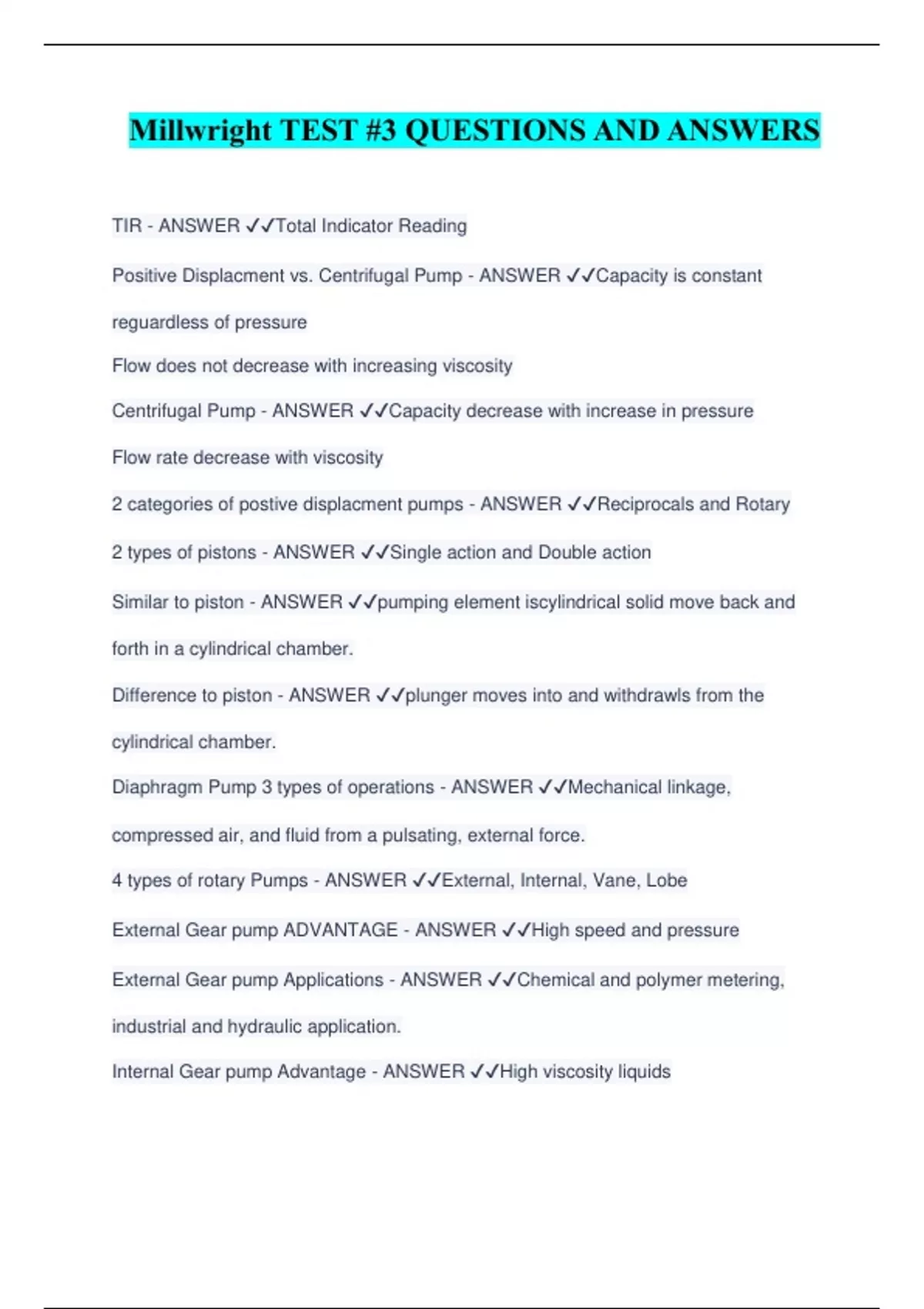 Millwright TEST #3 QUESTIONS AND ANSWERS TIR - ANSWER ️️ Total Indicator Reading Positive Displacment vs. Centrifugal Pump - ANSWER ️️ Capacity is constant reguardless of pressure Flow does not decrease with increasing viscosity Centrifugal Pump - ANSWER ️️ Capacity decrease with increase in pressure Flow rate decrease with viscosity 2 categories of postive displacment pumps - ANSWER ️️ Reciprocals and Rotary 2 types of pistons - ANSWER ️️ Single action and Double action Similar to piston - ANSWER ️️ pumping element iscylindrical solid move back and forth in a cylindrical chamber. Difference to piston - ANSWER ️️ plunger moves into and withdrawls from the cylindrical chamber. Diaphragm Pump 3 types of operations - ANSWER ️️ Mechanical linkage, compressed air, and fluid from a pulsating, external force. 4 types of rotary Pumps - ANSWER ️️ External, Internal, Vane, Lobe External Gear pump ADVANTAGE - ANSWER ️️ High speed and pressure External Gear pump Applications - ANSWER ️️ Chemical and polymer metering, industrial and hydraulic application. Internal Gear pump Advantage - ANSWER ️️ High viscosity liquids