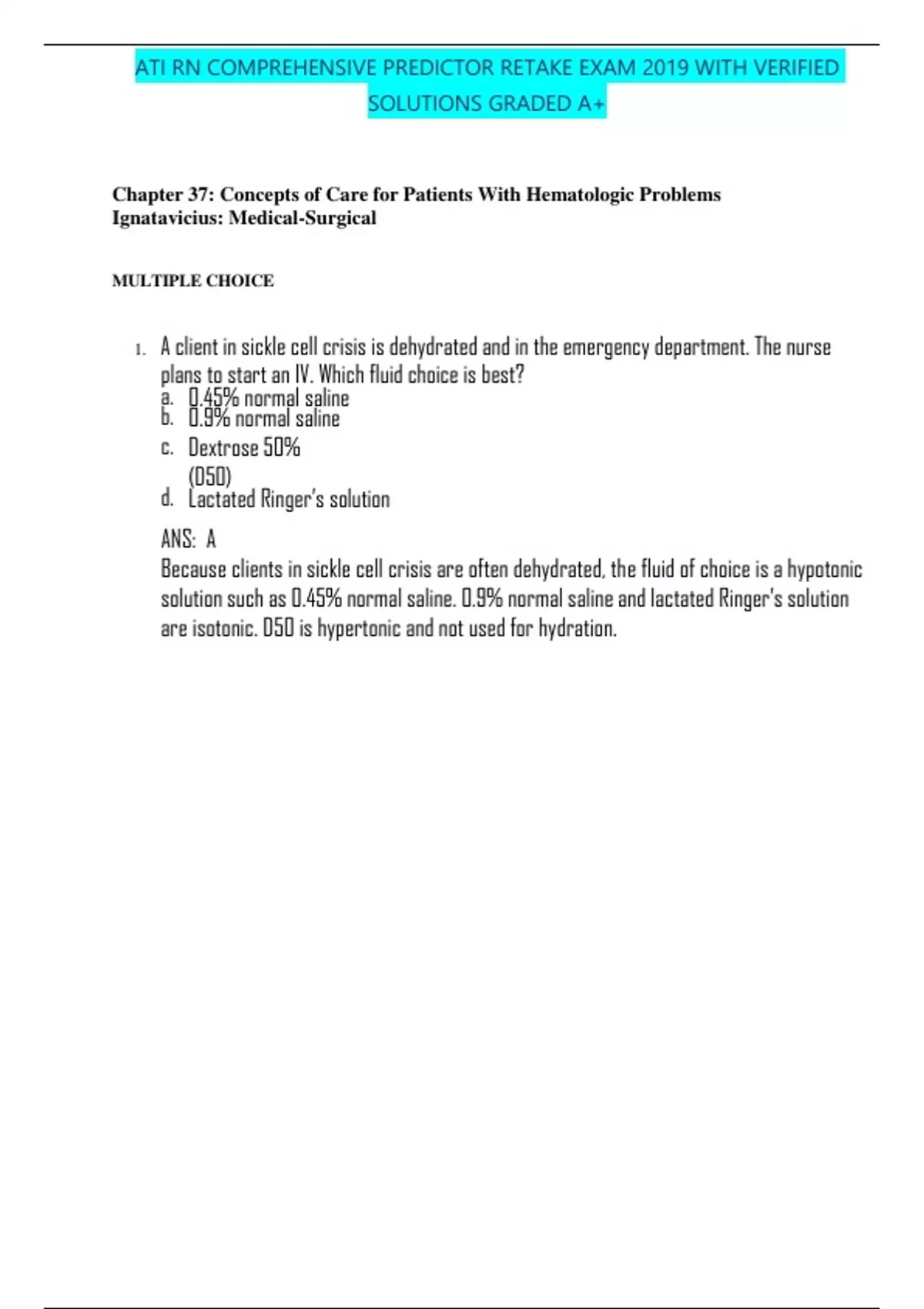 ATI RN COMPREHENSIVE PREDICTOR RETAKE EXAM 2019 WITH VERIFIED SOLUTIONS GRADED A+ Chapter 37: Concepts of Care for Patients With Hematologic Problems Ignatavicius: Medical-Surgical MULTIPLE CHOICE 1. A client insicklecell crisis is dehydrated and intheemergency department. Thenurse plans to start an IV. Which fluid choice is best? a. 0.45% normal saline b. 0.9% normal saline c. Dextrose 50% (D50) d. Lactated Ringer’s solution ANS: A Because clients in sickle cell crisis are often dehydrated, the fluid of choice is a hypotonic solutionsuch as 0.45% normal saline. 0.9% normal saline and lactated Ringer’s solution are isotonic. D50 is hypertonic and not used for hydration. DIF: Analyzing TOP:: IntaegbratierdbPs:mNu/rtsiengsPtrocess Analysis KEY: Hematologicsystem, Anemias, Fluidandelectrolyteimbalance, IVfluids, Hydration MSC: Client Needs Category: Physiological Integrity: Pharmacologicaland Parenteral Therapies 2. A client presents totheemergaenbcy irdbep.a crtmoemnt i/ntesic skl te cell diseasecrisis. What intervention by the nurse takes priority? a. Administeroxygen. b. Initiatepulse oximetry. c. Give pain medication. d. Start an IV line. ANS: A All actions are appropriate, but remembering the ABCs, oxygen would come first. The main problem in asicklecell crisis is tissueand organ hypoxia, soprovidingoxygen helps halt the process . DIF: Applying TOP: Integrated Process: Nursing Process: Implementation KEY: Hematologic system, Anemias, Oxygen, Oxygen therapy MSC: Client Needs Category: S a af b e a i n r d b E . ff c ec o tivm e C / a t re e E s nv t ironment: Managementof Care 3. A client hospitalized with sickle cell diseasecrisis frequentlyasks for opioid pain medications,oftenshortly after receiving adose. Thenurses on theunitbelievethat the client isdrugseeking. Whenthecliaenbt pamin m/ tedeicsatti o n , whatactionbythenurse is best? a. Give the client pain medication if it is time for another dose. b. Instruct theclientnot torequest pain medication too early. c. Request theprimary health care provider leave aprescription for a placebo. d. Tell the client that it is too early to have more pain medication. ANS: A Clients withsickle cell crisis often have severe pain that is managed withup to 48 hours of IV opioid analgesics. Even if the client is addicted and drug seeking, he or she is still in extreme pain. If the client can receive another dose of medication, the nurse would provide it. The other options are judgmental and do not address the client’s pain. Giving a placebo is unethical. DIF: Applying TOP: Integrated Process: Nursing Process: Implementation KEY: Hematologic system, Anemias, Pain, Caring MSC: Client Needs Category: Physiological Integrity: Physiological Adaptation 4. Thenurseiscaring foraclient experiencing sicklecell diseasecrisis. Which priority action would help prevent infection? c. Checking theclient’s white bloodcell count d. Performing frequent handwashing ANS: D Frequent and thorough handwashing is the most important intervention that helps prevent infection. Antibiotics are not usually used to prevent infection. Monitoring the client’s temperatureor whitebloodcell counthelps todetect thepresenceof infection, but prevent it. Implementation KEY: Hematologic system, Sickle cell disease MSC: Client Needs Category: SafeandEffective CareEnvironment: SafetyandInfection Control 5. A nursecaring for aclient withsicklecell disease (SCD) reviews theclient’s laboratory test results. Which finding would the nurse report to the primary health care provider? a. Creatinine:2.9 mg/dL (256 mcmol/L) b. Hematocrit: 30% c. Sodium: 146 mEq/L (146 mmol/L) d. Whiteblood cell count: 1a 2,0b 00ir/mbm. 3 c (o 12m 1/ 0t 9 e /Ls ) ANS: A An elevatedcreatinine indicates kidneydamage, which occurs in SCD. A hematocrit level of 30%isanexpectedfinding,aa s ib s air sb lig. hc tlyo emlev/ at tee dsw ht i t e bloodcellcountduetochronic inflammation. A sodium level of 146 mEq/L (146 mmol/L), although slightly high, is not concerning. DIF: Analyzing TOP: IntaegbratierdbPs:mCo/mtmeusnitcation and Documentation KEY: Hematologic system, Laboratory values, Anemias MSC: Client Needs Category: Physiological Integrity: Reductionof Risk Potential 6. Thenurseisassessingacli en a t i b ns i i r c b kle .c ce o ll mdise /a t s e e ( sSC tD)crisis. What priorityclient problem will the nurse expect? a. Infection b. Pallor c. Pain d. Fatigue