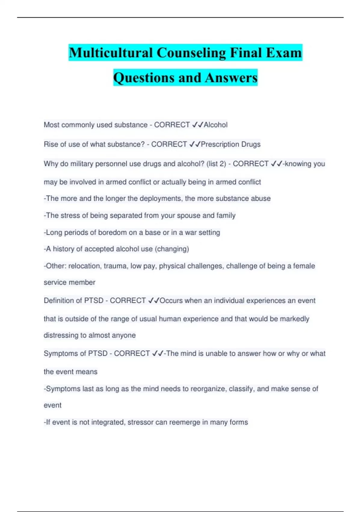 Multicultural Counseling Final Exam Questions and Answers Most commonly used substance - CORRECT ️️ Alcohol Rise of use of what substance? - CORRECT ️️ Prescription Drugs Why do military personnel use drugs and alcohol? (list 2) - CORRECT ️️ -knowing you may be involved in armed conflict or actually being in armed conflict -The more and the longer the deployments, the more substance abuse -The stress of being separated from your spouse and family -Long periods of boredom on a base or in a war setting -A history of accepted alcohol use (changing) -Other: relocation, trauma, low pay, physical challenges, challenge of being a female service member Definition of PTSD - CORRECT ️️ Occurs when an individual experiences an event that is outside of the range of usual human experience and that would be markedly distressing to almost anyone Symptoms of PTSD - CORRECT ️️ -The mind is unable to answer how or why or what the event means -Symptoms last as long as the mind needs to reorganize, classify, and make sense of event -If event is not integrated, stressor can reemerge in many form