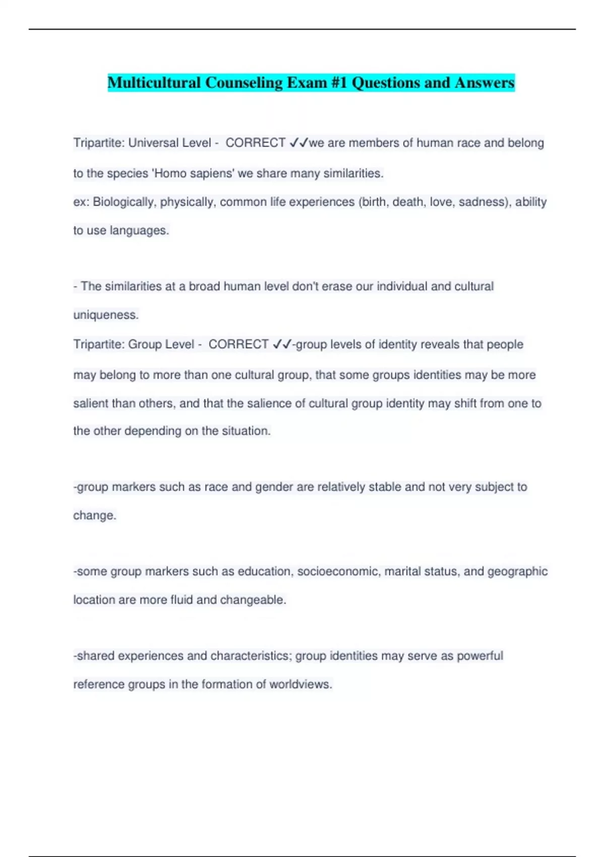 Multicultural Counseling Exam #1 Questions and Answers Tripartite: Universal Level - CORRECT ️️ we are members of human race and belong to the species 'Homo sapiens' we share many similarities. ex: Biologically, physically, common life experiences (birth, death, love, sadness), ability to use languages. - The similarities at a broad human level don't erase our individual and cultural uniqueness. Tripartite: Group Level - CORRECT ️️ -group levels of identity reveals that people may belong to more than one cultural group, that some groups identities may be more salient than others, and that the salience of cultural group identity may shift from one to the other depending on the situation. -group markers such as race and gender are relatively stable and not very subject to change. -some group markers such as education, socioeconomic, marital status, and geographic location are more fluid and changeable. -shared experiences and characteristics; group identities may serve as powerful reference groups in the formation of world