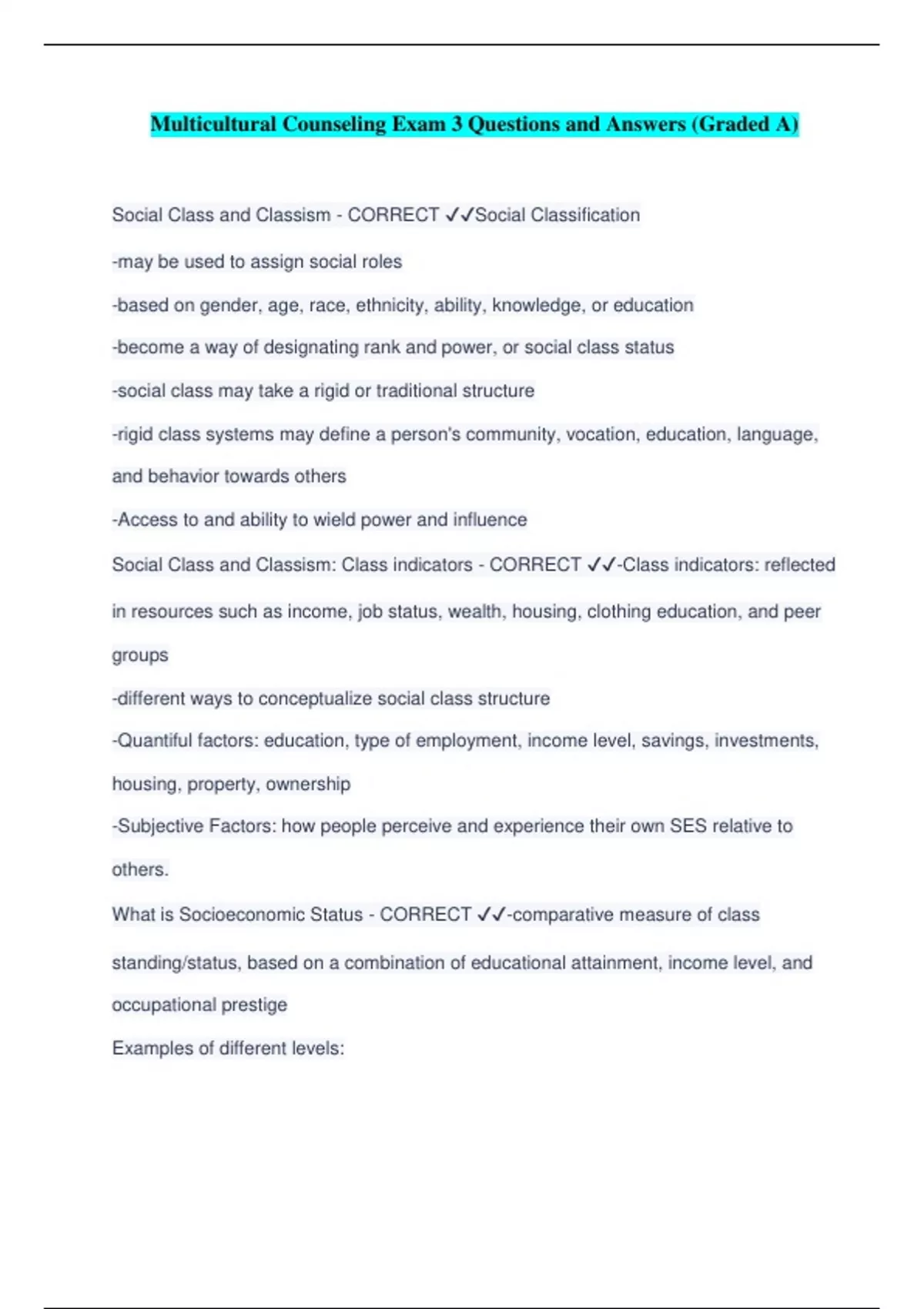 Multicultural Counseling Exam 3 Questions and Answers (Graded A) Social Class and Classism - CORRECT ️️ Social Classification -may be used to assign social roles -based on gender, age, race, ethnicity, ability, knowledge, or education -become a way of designating rank and power, or social class status -social class may take a rigid or traditional structure -rigid class systems may define a person's community, vocation, education, language, and behavior towards others -Access to and ability to wield power and influence Social Class and Classism: Class indicators - CORRECT ️️ -Class indicators: reflected in resources such as income, job status, wealth, housing, clothing education, and peer groups -different ways to conceptualize social class structure -Quantiful factors: education, type of employment, income level, savings, investments, housing, property, ownership -Subjective Factors: how people perceive and experience their own SES relative to others. What is Socioeconomic Status - CORRECT ️️ -comparative measure of class standing/status, based on a combination of educational attainment, income level, and occupational prestige Examples of different le