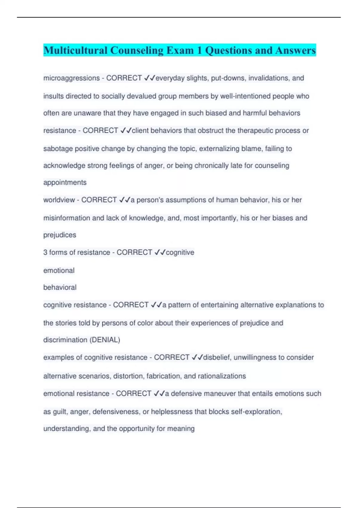 Multicultural Counseling Exam 1 Questions and Answers microaggressions - CORRECT ️️ everyday slights, put-downs, invalidations, and insults directed to socially devalued group members by well-intentioned people who often are unaware that they have engaged in such biased and harmful behaviors resistance - CORRECT ️️ client behaviors that obstruct the therapeutic process or sabotage positive change by changing the topic, externalizing blame, failing to acknowledge strong feelings of anger, or being chronically late for counseling appointments worldview - CORRECT ️️ a person's assumptions of human behavior, his or her misinformation and lack of knowledge, and, most importantly, his or her biases and prejudices 3 forms of resistance - CORRECT ️️ cognitive emotional behavioral cognitive resistance - CORRECT ️️ a pattern of entertaining alternative explanations to the stories told by persons of color about their experiences of prejudice and discrimination (DENIAL) examples of cognitive resistance - CORRECT ️️ disbelief, unwillingness to consider alternative scenarios, distortion, fabrication, and rationalizations emotional resistance - CORRECT ️️ a defensive maneuver that entails emotions such as guilt, anger, defensiveness, or helplessne