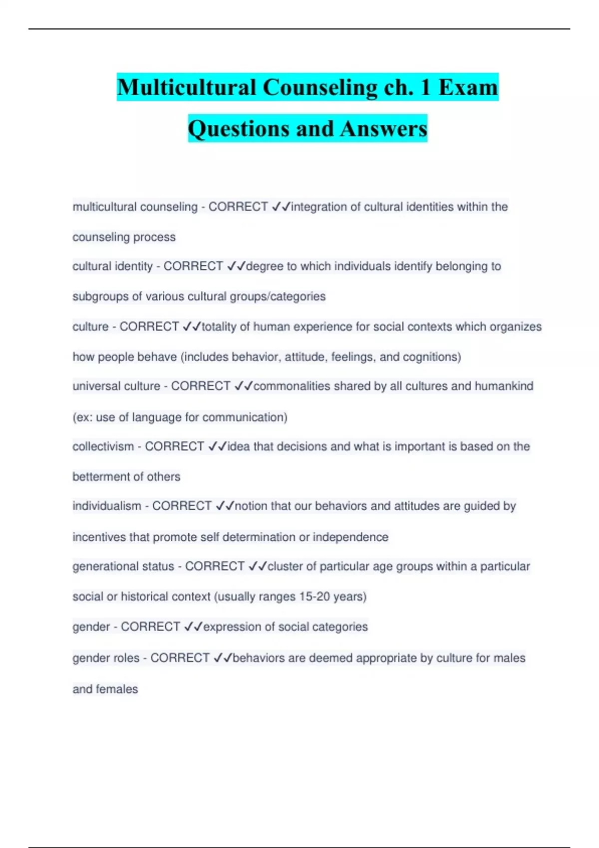 Multicultural Counseling ch. 1 Exam Questions and Answers multicultural counseling - CORRECT ️️ integration of cultural identities within the counseling process cultural identity - CORRECT ️️ degree to which individuals identify belonging to subgroups of various cultural groups/categories culture - CORRECT ️️ totality of human experience for social contexts which organizes how people behave (includes behavior, attitude, feelings, and cognitions) universal culture - CORRECT ️️ commonalities shared by all cultures and humankind (ex: use of language for communication) collectivism - CORRECT ️️ idea that decisions and what is important is based on the betterment of others individualism - CORRECT ️️ notion that our behaviors and attitudes are guided by incentives that promote self determination or independence generational status - CORRECT ️️ cluster of particular age groups within a particular social or historical context (usually ranges 15-20 years) gender - CORRECT ️️ expression of social categories gender roles - CORRECT ️️ behaviors are de