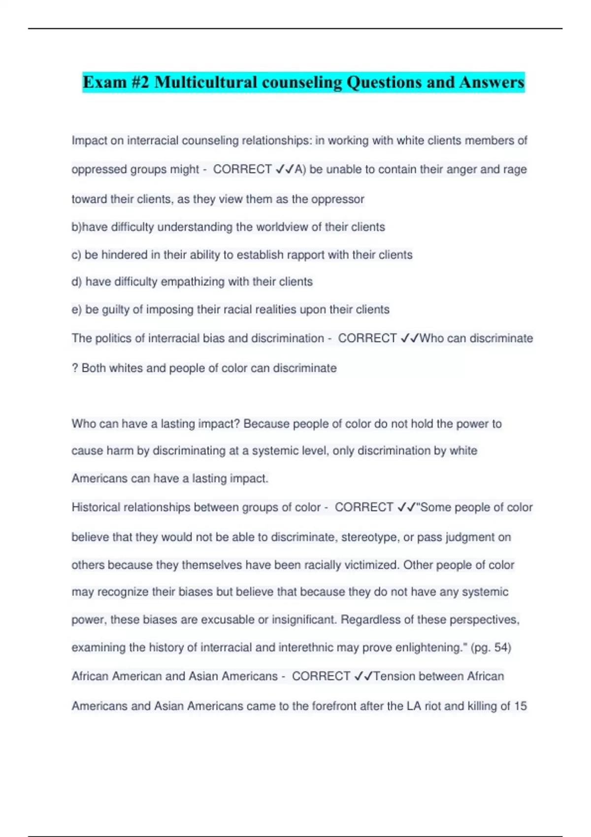 Multicultural Counseling Exam with complete solutions What is meant by 'Cultural Sensitivity?' - CORRECT ️️ striving to identify and understand the diverse cultural backgrounds of clients by gaining knowledge, personal awareness, and developing sensitivity and skills pertinent to working with a diverse client population Based on the Hwang & Wood (2007) article, how do you understand the differences between cultural competency and cultural sensitivity? Use examples from the case of TC to support your points. - CORRECT ️️ What is meant by 'Cultural Competence?' - CORRECT ️️ Having the capacity to value diversity, conduct self-assessment, manage dynamics of difference, institutionalize cultural knowledge, and adapt to diversity and cultural contexts of the communities they serve What is meant by 'Cultural Awareness?' - CORRECT ️️ Perceptive enough to be able to sense cultural differences among people and know how to appreciate them without ignorance, bias, prejudice, or stereotyping