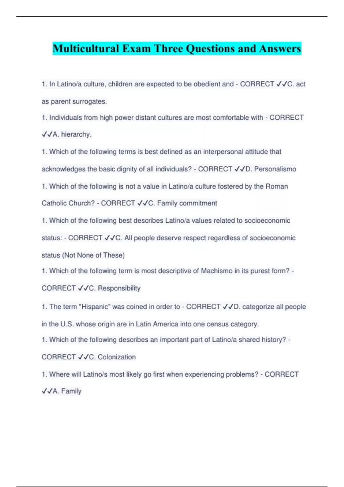 Multicultural Exam Three Questions and Answers 1. In Latino/a culture, children are expected to be obedient and - CORRECT ️️ C. act as parent surrogates. 1. Individuals from high power distant cultures are most comfortable with - CORRECT ️️ A. hierarchy. 1. Which of the following terms is best defined as an interpersonal attitude that acknowledges the basic dignity of all individuals? - CORRECT ️️ D. Personalismo 1. Which of the following is not a value in Latino/a culture fostered by the Roman Catholic Church? - CORRECT ️️ C. Family commitment 1. Which of the following best describes Latino/a values related to socioeconomic status: - CORRECT ️️ C. All people deserve respect regardless of socioeconomic status (Not None of These) 1. Which of the following term is most descriptive of Machismo in its purest form? - CORRECT ️️ C. Responsibility 1. The term "Hispanic" was coined in order to - CORRECT ️️ D. categorize all people in the U.S. whose origin are in Latin America into one census category. 1. Which of the following describes an important part of Latino/a shared history? - CORRECT ️️ C. Colonization