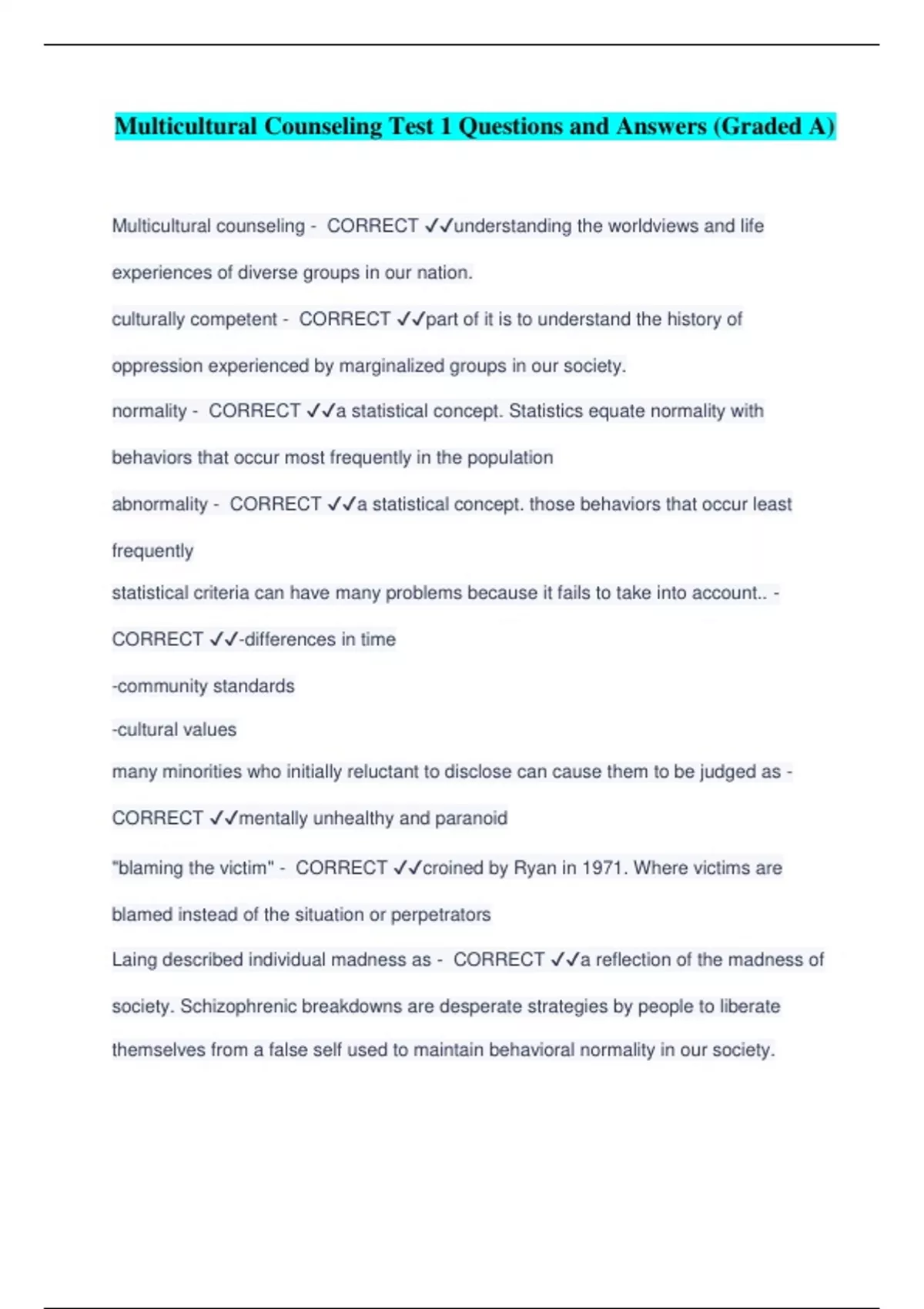 Multicultural Counseling Test 1 Questions and Answers (Graded A) Multicultural counseling - CORRECT ️️ understanding the worldviews and life experiences of diverse groups in our nation. culturally competent - CORRECT ️️ part of it is to understand the history of oppression experienced by marginalized groups in our society. normality - CORRECT ️️ a statistical concept. Statistics equate normality with behaviors that occur most frequently in the population abnormality - CORRECT ️️ a statistical concept. those behaviors that occur least frequently statistical criteria can have many problems because it fails to take into account.. - CORRECT ️️ -differences in time -community standards -cultural values many minorities who initially reluctant to disclose can cause them to be judged as - CORRECT ️️ mentally unhealthy and paranoid "blaming the victim" - CORRECT ️️ croined by Ryan in 1971. Where victims are blamed instead of the situation or perpetrators Laing described individual madness as - CORRECT ️️ a reflection of the madness of society. Schizophrenic breakdowns are de