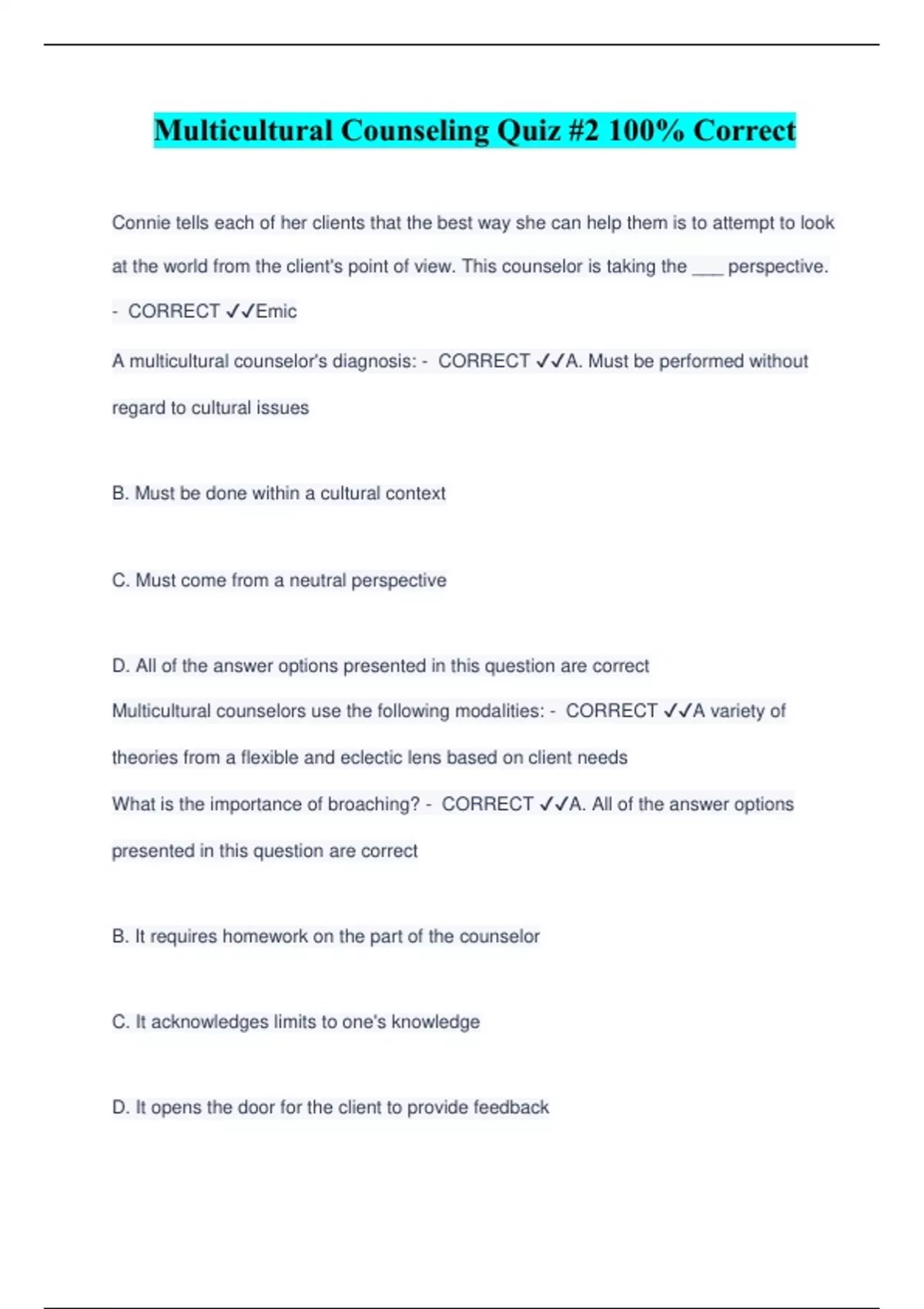 Multicultural Counseling Quiz #2 100% Correct Connie tells each of her clients that the best way she can help them is to attempt to look at the world from the client's point of view. This counselor is taking the ___ perspective. - CORRECT ️️ Emic A multicultural counselor's diagnosis: - CORRECT ️️ A. Must be performed without regard to cultural issues B. Must be done within a cultural context C. Must come from a neutral perspective D. All of the answer options presented in this question are correct Multicultural counselors use the following modalities: - CORRECT ️️ A variety of theories from a flexible and eclectic lens based on client needs What is the importance of broaching? - CORRECT ️️ A. All of the answer options presented in this question are correc