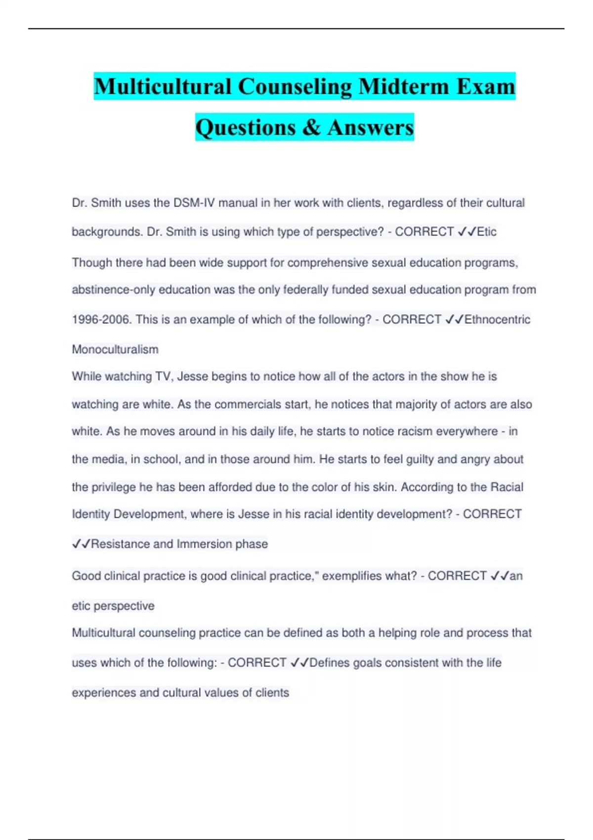 Multicultural Counseling Midterm Exam Questions & Answers Dr. Smith uses the DSM-IV manual in her work with clients, regardless of their cultural backgrounds. Dr. Smith is using which type of perspective? - CORRECT ️️ Etic Though there had been wide support for comprehensive sexual education programs, abstinence-only education was the only federally funded sexual education program from . This is an example of which of the following? - CORRECT ️️ Ethnocentric Monoculturalism While watching TV, Jesse begins to notice how all of the actors in the show he is watching are white. As the commercials start, he notices that majority of actors are also white. As he moves around in his daily life, he starts to notice racism everywhere - in the media, in school, and in those around him. He starts to feel guilty and angry about the privilege he has been afforded due to the color of his skin. According to the Racial Identity Development, where is Jesse in his racial identity development? - CORRECT ️️ Resistance and Immersion phase Good clinical practice is good clinical practice," exemplifies what? - CORRECT ️️ an etic perspective Multicultural counseling practice can be defined as both a helping role and process that uses which of the following: - CORRECT ️️ Defines goals consistent with the life experiences and cultural values of clie