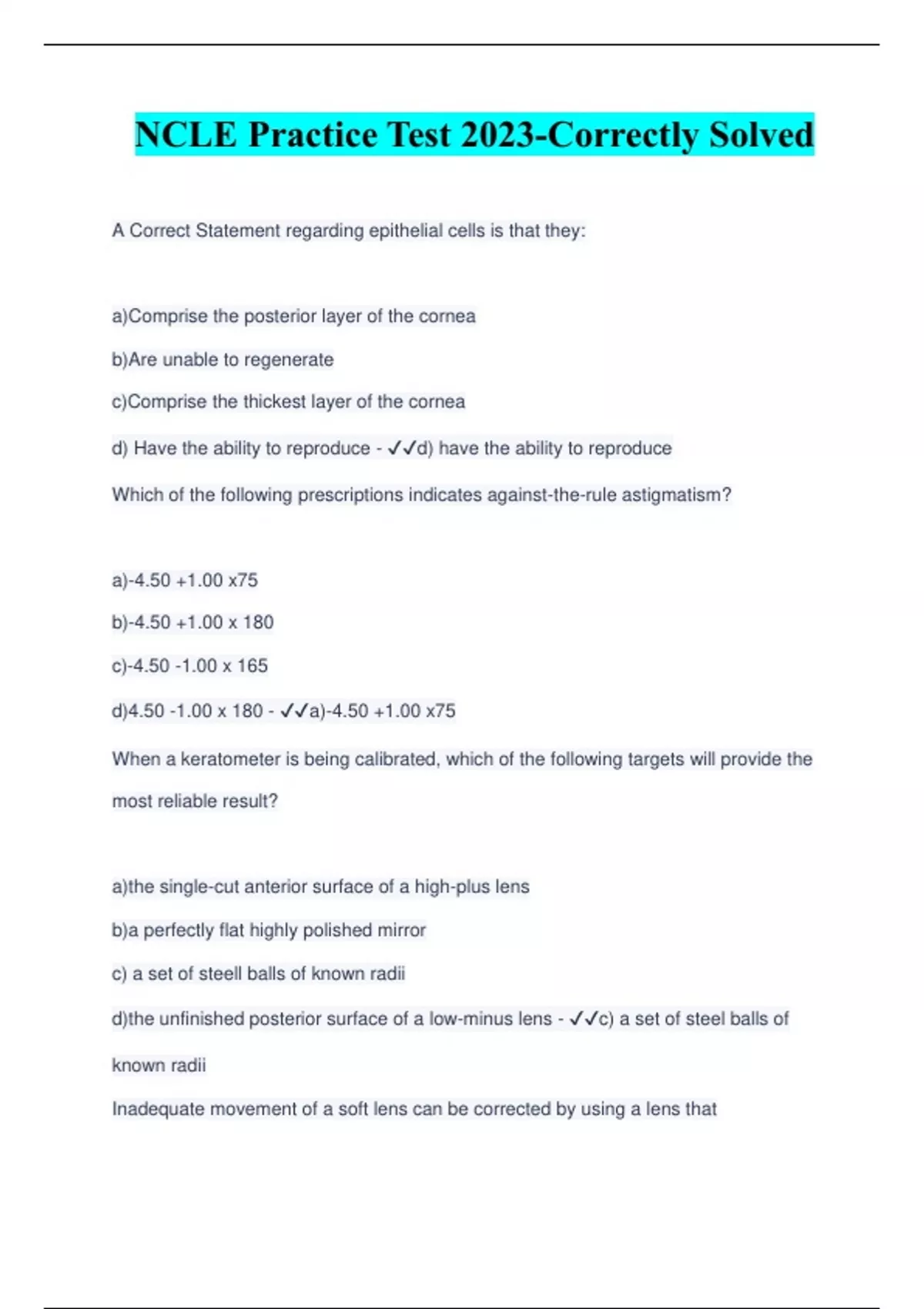 NCLE Practice Test 2023-Correctly Solved A Correct Statement regarding epithelial cells is that they: a)Comprise the posterior layer of the cornea b)Are unable to regenerate c)Comprise the thickest layer of the cornea d) Have the ability to reproduce - ️️ d) have the ability to reproduce Which of the following prescriptions indicates against-the-rule astigmatism? a)-4.50 +1.00 x75 b)-4.50 +1.00 x 180 c)-4.50 -1.00 x 165 d)4.50 -1.00 x 180 - ️️ a)-4.50 +1.00 x75 When a keratometer is being calibrated, which of the following targets will provide the most reliable result? a)the single-cut anterior surface of a high-plus lens b)a perfectly flat highly polished mirror c) a set of steell balls of known radii d)the unfinished posterior surface of a low-minus lens - ️️ c) a set of steel balls of known radii Inadequate movement of a soft lens can be corrected by using a lens tha