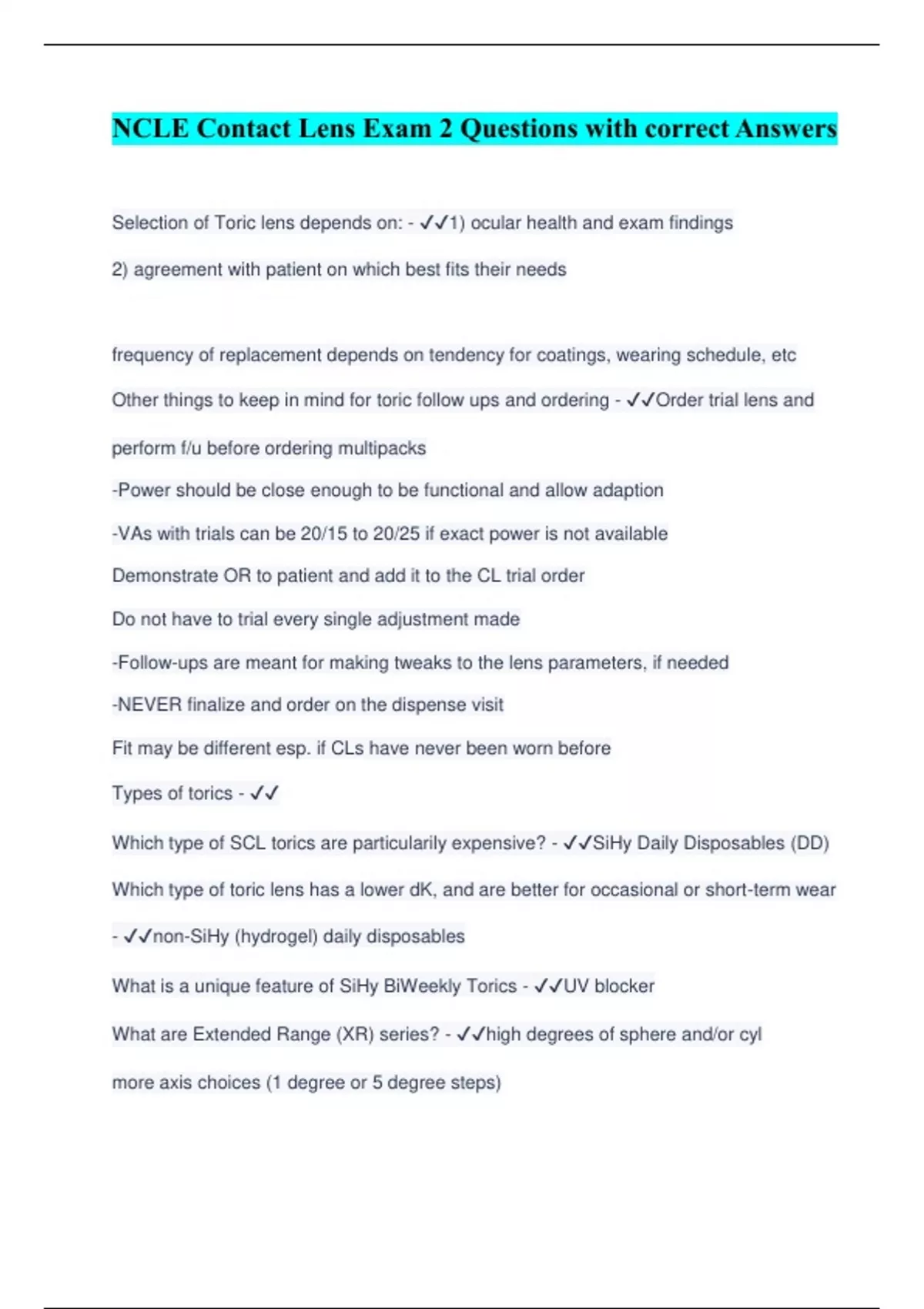 NCLE Contact Lens Exam 2 Questions with correct Answers Selection of Toric lens depends on: - ️️ 1) ocular health and exam findings 2) agreement with patient on which best fits their needs frequency of replacement depends on tendency for coatings, wearing schedule, etc Other things to keep in mind for toric follow ups and ordering - ️️ Order trial lens and perform f/u before ordering multipacks -Power should be close enough to be functional and allow adaption -VAs with trials can be 20/15 to 20/25 if exact power is not available Demonstrate OR to patient and add it to the CL trial order Do not have to trial every single adjustment made -Follow-ups are meant for making tweaks to the lens parameters, if needed -NEVER finalize and order on the dispense visit Fit may be different esp. if CLs have never been worn before Types of torics - ️️ Which type of SCL torics are particularily expensive? - ️️ SiHy Daily Disposables (DD) Which type of toric lens has a lower dK, and are better for occasional or short-term wear - ️️ non-SiHy (hydrogel) daily disposables What is a unique feature of SiHy BiWeekly Torics - ️️ UV blocker What are Extended Range (XR) series? - ️️ high degrees of sphere and/or cyl more axis choices (1 degree or 5 degree steps