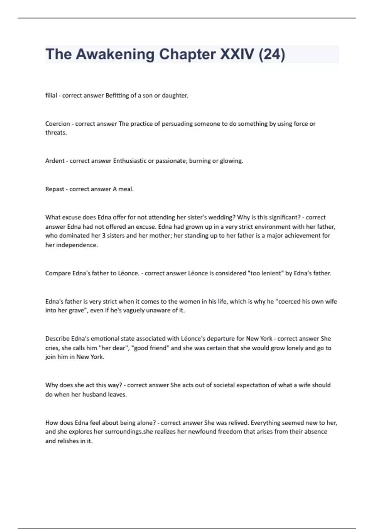 The Awakening Chapter XXIV (24 Question and answers correctly solved 2023/2024 filial - correct answer Befitting of a son or daughter. Coercion - correct answer The practice of persuading someone to do something by using force or threats. Ardent - correct answer Enthusiastic or passionate; burning or glowing. Repast - correct answer A meal. What excuse does Edna offer for not attending her sister's wedding? Why is this significant? - correct answer Edna had not offered an excuse. Edna had grown up in a very strict environment with her father, who dominated her 3 sisters and her mother; her standing up to her father is a major achievement for her independence.