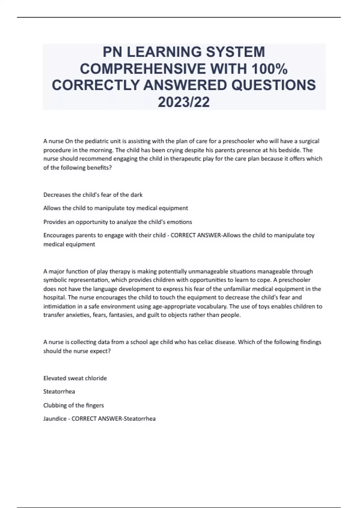 PN LEARNING SYSTEM COMPREHENSIVE WITH 100% CORRECTLY ANSWERED QUESTIONS 2023/22 A nurse On the pediatric unit is assisting with the plan of care for a preschooler who will have a surgical procedure in the morning. The child has been crying despite his parents presence at his bedside. The nurse should recommend engaging the child in therapeutic play for the care plan because it offers which of the following benefits? Decreases the child's fear of the dark Allows the child to manipulate toy medical equipment Provides an opportunity to analyze the child's emotions Encourages parents to engage with their child - CORRECT ANSWER-Allows the child to manipulate toy medical equipment A major function of play therapy is making potentially unmanageable situations manageable through symbolic representation, which provides children with opportunities to learn to cope. A preschooler does not have the language development to express his fear of the unfamiliar medical equipment in the hospital. The nurse encourages the child to touch the equipment to decrease the child's fear and intimidation in a safe environment using age-appropriate vocabulary. The use of toys enables children to transfer anxieties, fears, fantasies, and guilt to objects rather than people. A nurse is collecting data from a school age child who has celiac disease. Which of the following findings should the nurse expect? Elevated sweat chloride Steatorrhea Clubbing of the fingers Jaundice - CORRECT ANSWER-Steatorrhea