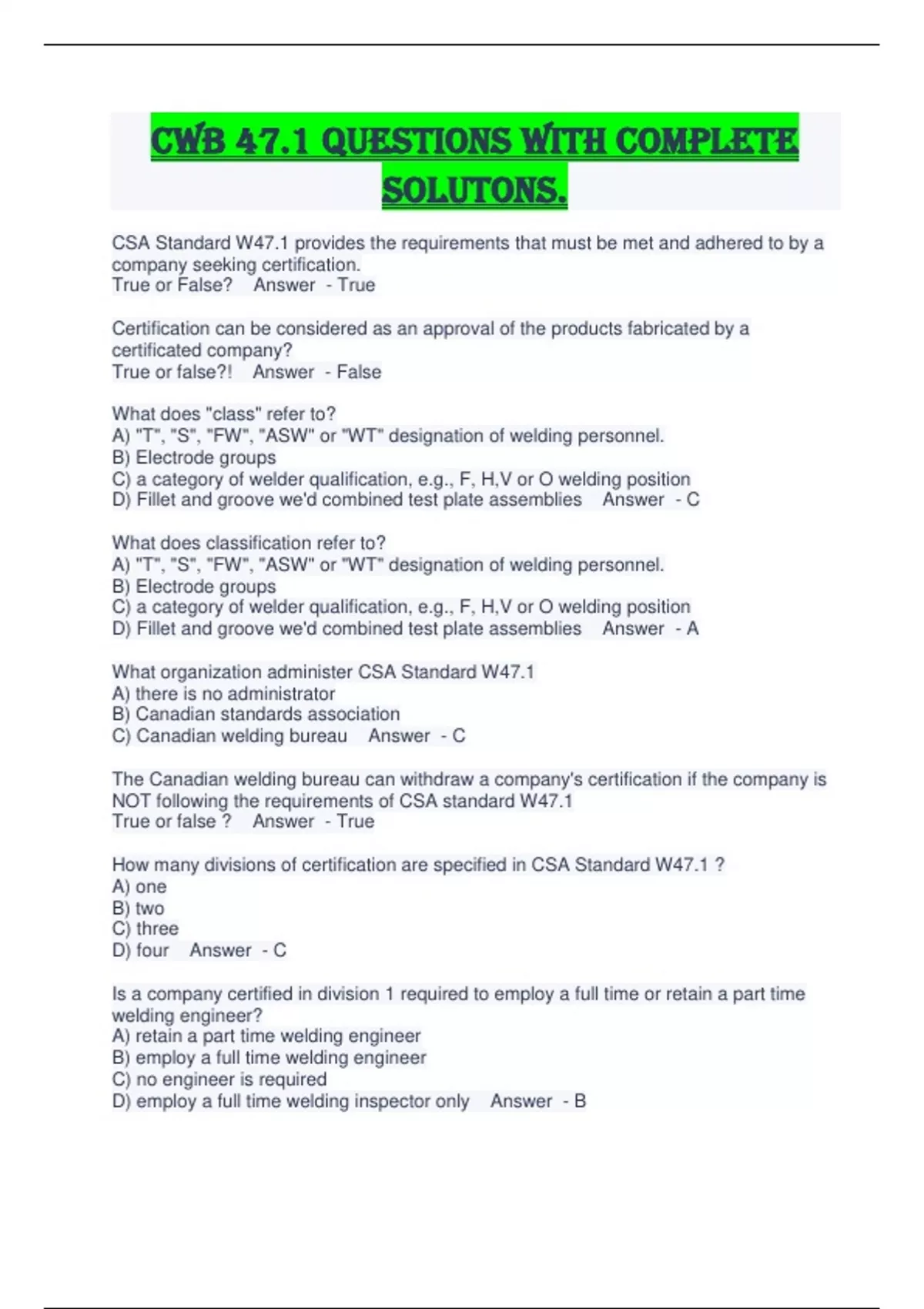 cwb 471 questions with complete solutons