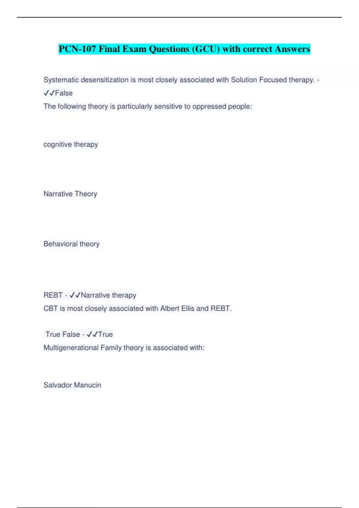 PCN-107 Final Exam Questions (GCU) with correct Answers Systematic desensitization is most closely associated with Solution Focused therapy. - ️️ False The following theory is particularly sensitive to oppressed people: cognitive therapy Narrative Theory Behavioral theory REBT - ️️ Narrative therapy CBT is most closely associated with Albert Ellis and REBT. True False - ️️ True Multigenerational Family theory is associated with: Salvador Manucin Virginal Satir Murry Bowen Jay Haley - ️️ Murry Bowen Narrative therapy is a process that is concerned with the following
