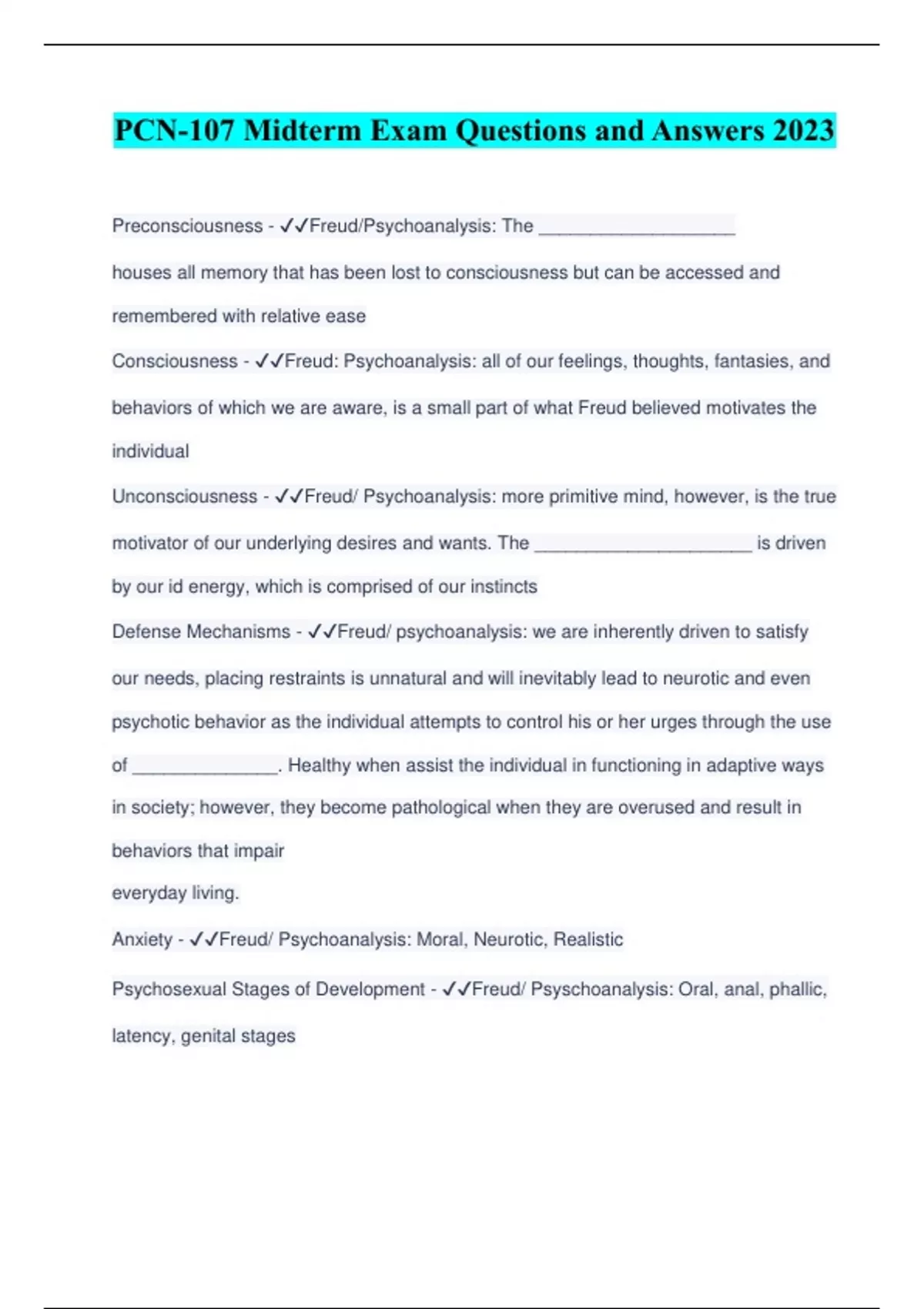 PCN-107 Midterm Exam Questions and Answers 2023 Preconsciousness - ️️ Freud/Psychoanalysis: The ___________________ houses all memory that has been lost to consciousness but can be accessed and remembered with relative ease Consciousness - ️️ Freud: Psychoanalysis: all of our feelings, thoughts, fantasies, and behaviors of which we are aware, is a small part of what Freud believed motivates the individual Unconsciousness - ️️ Freud/ Psychoanalysis: more primitive mind, however, is the true motivator of our underlying desires and wants. The _____________________ is driven by our id energy, which is comprised of our instincts Defense Mechanisms - ️️ Freud/ psychoanalysis: we are inherently driven to satisfy our needs, placing restraints is unnatural and will inevitably lead to neurotic and even psychotic behavior as the individual attempts to control his or her urges through the use of ______________. Healthy when assist the individual in functioning in adaptive ways in society; however, they become pathological when they are overused and result in behaviors that impair everyday living. Anxiety - ️️ Freud/ Psychoanalysis: Moral, Neurotic, Realistic Psychosexual Stages of Development - ️️ Freud/ Psyschoanalysis: Oral, anal, phallic, latency, genital stages