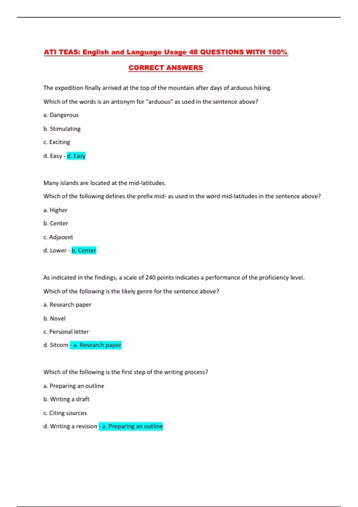 The expedition finally arrived at the top of the mountain after days of arduous hiking. Which of the words is an antonym for "arduous" as used in the sentence above? a. Dangerous b. Stimulating c. Exciting d. Easy - d. Easy Many islands are located at the mid-latitudes. Which of the following defines the prefix mid- as used in the word mid-latitudes in the sentence above? a. Higher b. Center c. Adjacent d. Lower - b. Center As indicated in the findings, a scale of 240 points indicates a performance of the proficiency level. Which of the following is the likely genre for the sentence above? a. Research paper b. Novel c. Personal letter d. Sitcom - a. Research paper