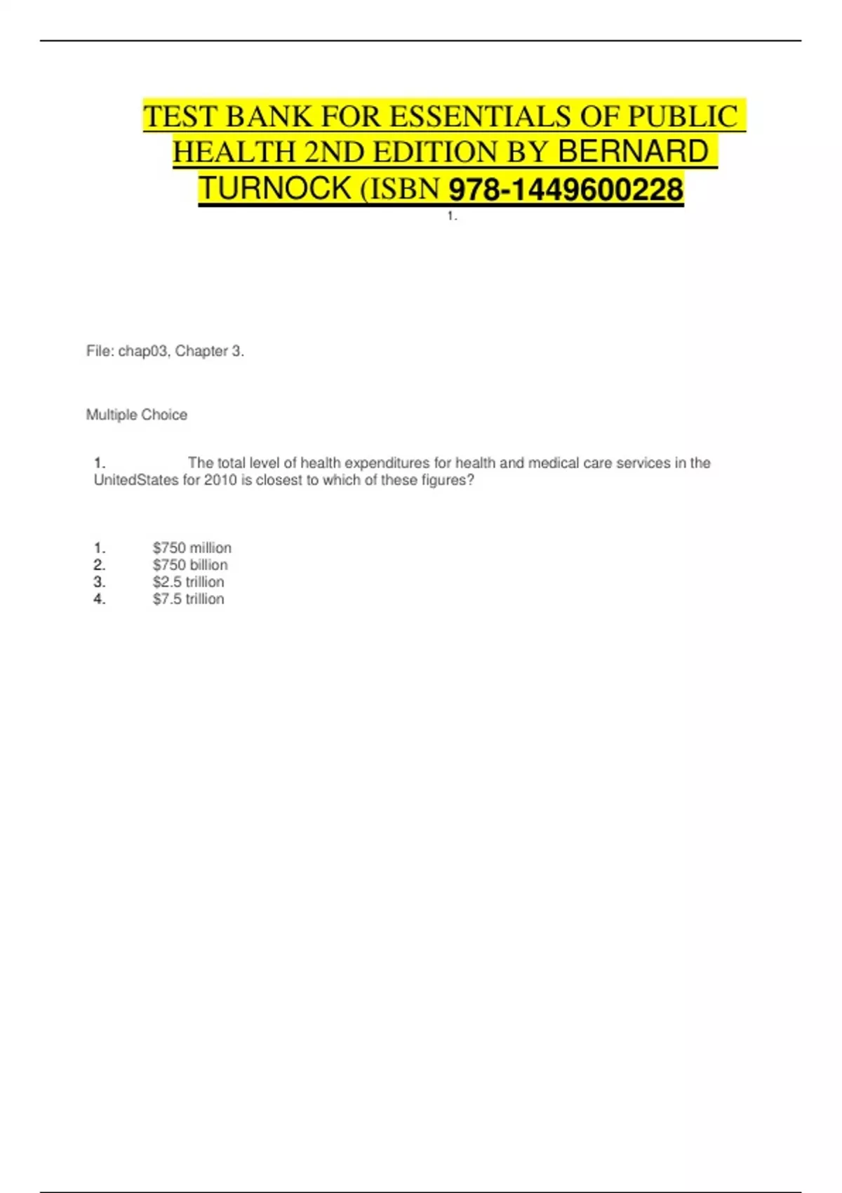 TEST BANK FOR ESSENTIALS OF PUBLIC HEALTH 2ND EDITION BY BERNARD TURNOCK (ISBN 978-1449600228