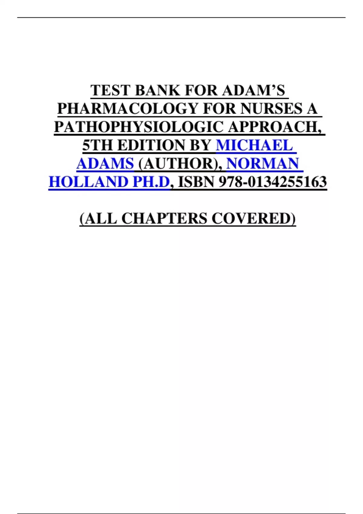 TEST BANK FOR ADAM’S PHARMACOLOGY FOR NURSES A PATHOPHYSIOLOGIC APPROACH, 5TH EDITION BY MICHAEL ADAMS (AUTHOR), NORMAN HOLLAND PH.D, ISBN 978-0134255163 (ALL CHAPTERS COVERED)