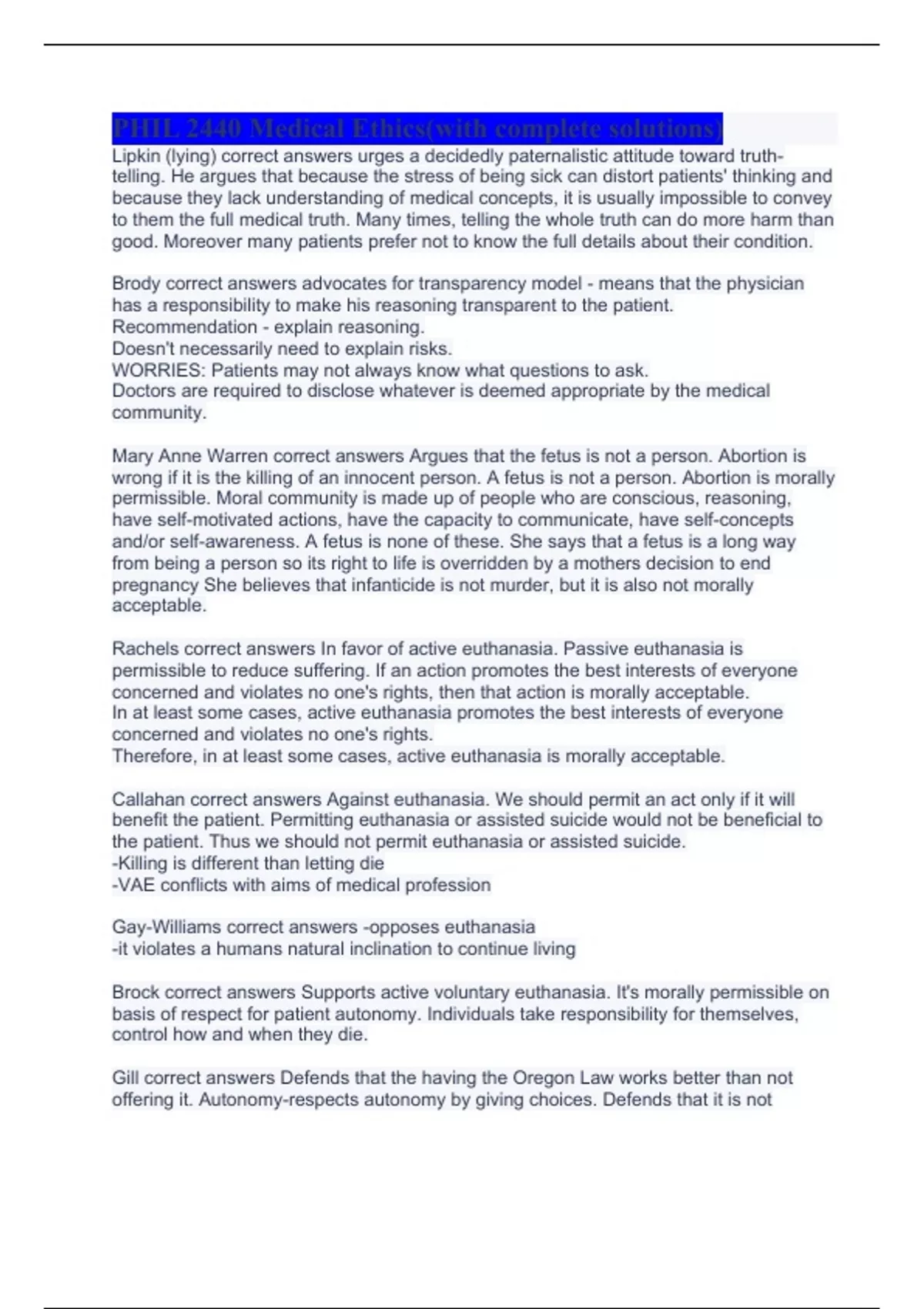 Lipkin (lying) correct answers urges a decidedly paternalistic attitude toward truth-telling. He argues that because the stress of being sick can distort patients' thinking and because they lack understanding of medical concepts, it is usually impossible to convey to them the full medical truth. Many times, telling the whole truth can do more harm than good. Moreover many patients prefer not to know the full details about their condition. Brody correct answers advocates for transparency model - means that the physician has a responsibility to make his reasoning transparent to the patient. Recommendation - explain reasoning. Doesn't necessarily need to explain risks. WORRIES: Patients may not always know what questions to ask. Doctors are required to disclose whatever is deemed appropriate by the medical community. Mary Anne Warren correct answers Argues that the fetus is not a person. Abortion is wrong if it is the killing of an innocent person. A fetus is not a person. Abortion is morally permissible. Moral community is made up of people who are conscious, reasoning, have self-motivated actions, have the capacity to communicate, have self-concepts and/or self-awareness. A fetus is none of these. She says that a fetus is a long way from being a person so its right to life is overridden by a mothers decision to end pregnancy She believes that infanticide is not murder, but it is also not morally acceptable. Rachels correct answers In favor of active euthanasia. Passive euthanasia is permissible to reduce suffering. If an action promotes the best interests of everyone concerned and violates no one's rights, then that action is morally acceptable. In at least some cases, active euthanasia promotes the best interests of everyone concerned and violates no one's rights. Therefore, in at least some cases, active euthanasia is morally acceptable. Callahan correct answers Against euthanasia. We should permit an act only if it will benefit the patient. Permitting euthanasia or assisted suicide would not be beneficial to the patient. Thus we should not permit euthanasia or assisted suicide. -Killing is different than letting die -VAE conflicts with aims of medical profession Gay-Williams correct answers -opposes euthanasia -it violates a humans natural inclination to continue living Brock correct answers Supports active voluntary euthanasia. It's morally permissible on basis of respect for patient autonomy. Individuals take responsibility for themselves, control how and when they die. Gill correct answers Defends that the having the Oregon Law works better than not offering it. Autonomy-respects autonomy by giving choices. Defends that it is not