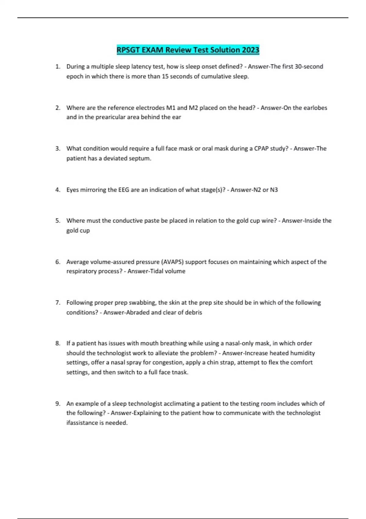 RPSGT EXAM Review Test Solution 2023 1. During a multiple sleep latency test, how is sleep onset defined? - Answer-The first 30-second epoch in which there is more than 15 seconds of cumulative sleep. 2. Where are the reference electrodes M1 and M2 placed on the head? - Answer-On the earlobes and in the prearicular area behind the ear 3. What condition would require a full face mask or oral mask during a CPAP study? - Answer-The patient has a deviated septum. 4. Eyes mirroring the EEG are an indication of what stage(s)? - Answer-N2 or N3 5. Where must the conductive paste be placed in relation to the gold cup wire? - Answer-Inside the gold cup 6. Average volume-assured pressure (AVAPS) support focuses on maintaining which aspect of the respiratory process? - Answer-Tidal volume 7. Following proper prep swabbing, the skin at the prep site should be in which of the following conditions? - Answer-Abraded and clear of debris 8. If a patient has issues with mouth breathing while using a nasal-only mask, in which order should the technologist work to alleviate the problem? - Answer-Increase heated humidity settings, offer a nasal spray for congestion, apply a chin strap, attempt to flex the comfort settings, and then switch to a full face tnask. 9. An example of a sleep technologist acclimating a patient to the testing room includes which of the following? - A 13. What is the sleep efficiency formula? - Answer-[TST/TRT] X 100 14. What is the formula used to calculate AHI? - Answer-[Total apneas and hypopneas/TST] X 60 15. During a BiPAP titration, acceptable changes to the settings when a patient begins having complex sleep apnea include which ofthe following? - Answer-Change to a spontaneous-timed mode with a backup rate or reduce IPAP settings. 16. The artifacts that are most likely to cause high-amplitude, low-frequency waves seen on the EEG are - Answer-respiratory artifacts 17. True statements about quantitative values for end tidal carbon dioxide (CO2) monitoring include all of the following EXCEPT - Answer-it only provides a range of CO2 values. 18. Accoring to the AASM what is the maximum IPAP setting when using BiPAP on a patient over 12 years of age? - Answer-30cm 19. Is an arousal needed to score a RERA in pediatric patients? - Answer...