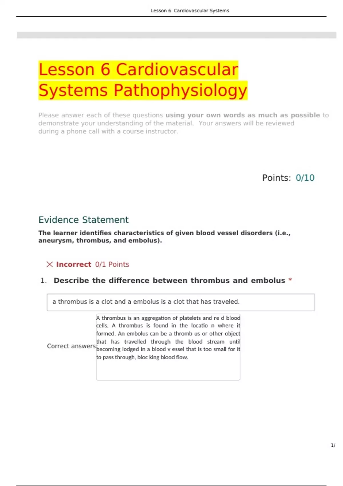 Lesson 6 Cardiovascular Systems Pathophysiology Please answer each of these questions using your own words as much as possible to demonstrate your understanding of the material. Your answers will be reviewed during a phone call with a course instructor. Evidence Statement The learner identifies characteristics of given blood vessel disorders (i.e., aneurysm, thrombus, and embolus). Incorrect 0/1 Points 1. Describe the difference between thrombus and embolus * Correct answers: A thrombus is an aggregation of platelets and re d blood cells. A thrombus is found in the locatio n where it formed. An embolus can be a thromb us or other object that has travelled through the blood stream until becoming lodged in a blood v essel that is too small for it to pass through, bloc king blood flow