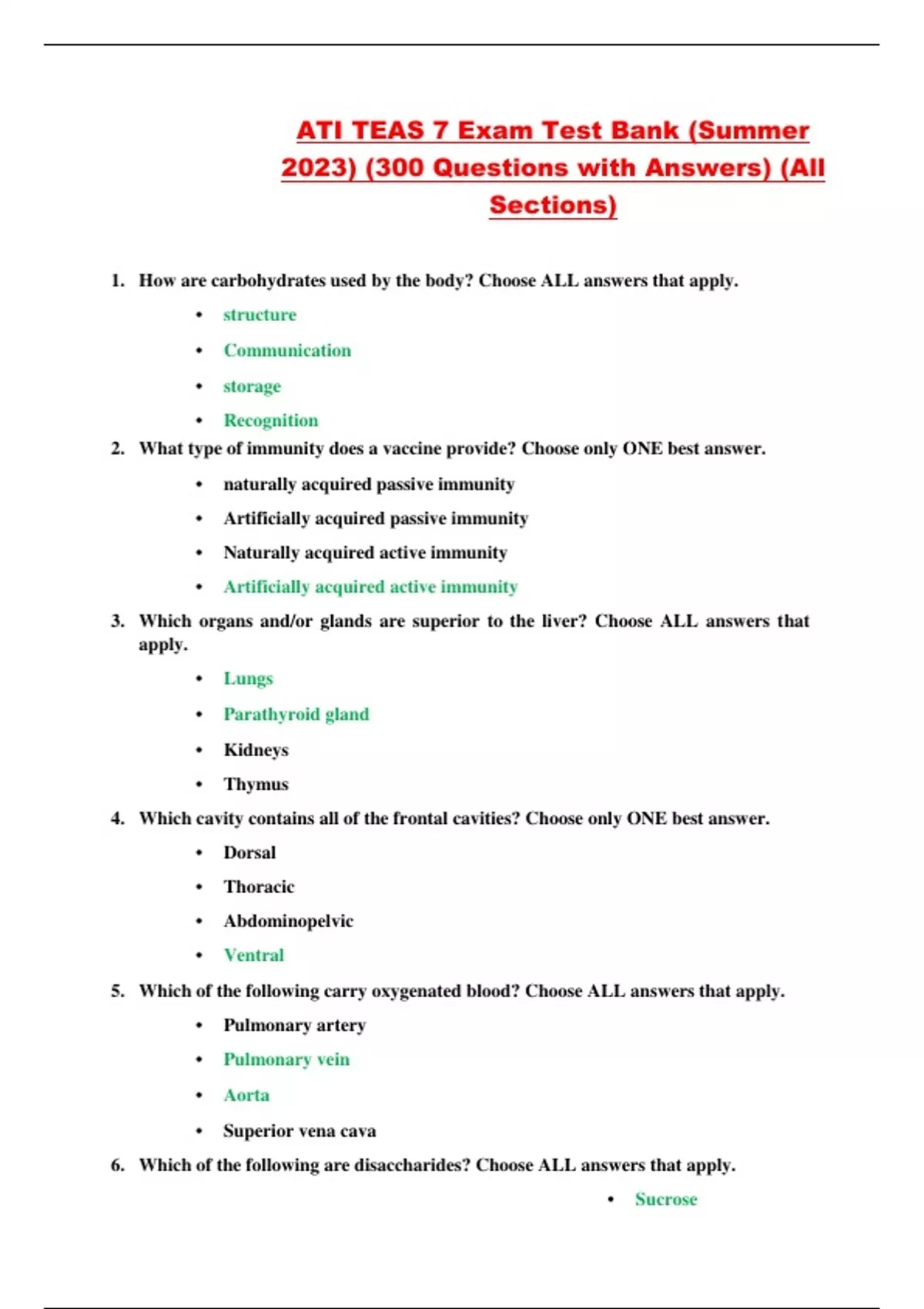 1. How are carbohydrates used by the body? Choose ALL answers that apply. • structure • Communication • storage • Recognition 2. What type of immunity does a vaccine provide? Choose only ONE best answer. • naturally acquired passive immunity • Artificially acquired passive immunity • Naturally acquired active immunity • Artificially acquired active immunity 3. Which organs and/or glands are superior to the liver? Choose ALL answers that apply. • Lungs • Parathyroid gland • Kidneys • Thymus 4. Which cavity contains all of the frontal cavities? Choose only ONE best answer. • Dorsal • Thoracic • Abdominopelvic • Ventral 5. Which of the following carry oxygenated blood? Choose ALL answers that apply. • Pulmonary artery • Pulmonary vein • Aorta • Superior vena cava