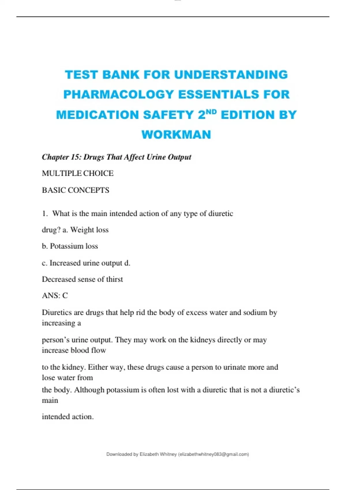 TEST BANK FOR UNDERSTANDING PHARMACOLOGY ESSENTIALS FOR MEDICATION SAFETY 2ND EDITION BY WORKMAN Chapter 15: Drugs That Affect Urine Output MULTIPLE CHOICE BASIC CONCEPTS 1. What is the main intended action of any type of diuretic drug? a. Weight loss b. Potassium loss c. Increased urine output d. Decreased sense of thirst ANS: C Diuretics are drugs that help rid the body of excess water and sodium by increasing a person’s urine output. They may work on the kidneys directly or may increase blood flow to the kidney. Either way, these drugs cause a person to urinate more and lose water from the body. Although potassium is often lost with a diuretic that is not a diuretic’s main intended action. lOMoAR cPSD| Downloaded by Elizabeth Whitney () DIF: Cognitive Level: Remembering REF: p. 239 2. For which complication should you remain alert when a patient is taking any type of diuretic? a. Loss of appetite b. Bladder spasms c. Hypertension d. Dehydration ANS: D Any type of diuretic increases water loss through urination. This water loss can cause dehydration if a patient’s fluid intake does not keep pace with his or her urine output. DIF: Cognitive Level: Remembering REF: pp. 240-241 lOMoAR cPSD| Downloaded by Elizabeth Whitney () 3. What is the most common health problem treated by diuretic drugs? a. High blood pressure b. Tongue swelling c. Constipation d. Obesity ANS: A Diuretics are used most often to treat problems when the body is retaining too much water, too much sodium, or too much potassium. They are often prescribed for people who have the following health problems: high blood pressure (hypertension), heart failure, kidney disease, and liver disease (cirrhosis). DIF: Cognitive Level: Remembering REF: p. 241 4. Which type of diuretic can cause higher than normal blood calcium levels? a. Loop diuretics b. Osmotic diuretics lOMoAR cPSD| Downloaded by Elizabeth Whitney () c. Thiazide diuretics d. Potassium-sparing diuretics ANS: C Potential side effects of thiazide diuretics include fluid and electrolyte imbalances such as decreased blood volume, decreased potassium (hypokalemia), decreased sodium (hyponatremia), decreased chloride (hypochloremia), and decreased magnesium (hypomagnesemia), along with increased calcium (hypercalcemia) and increased urea (hyperuremia). DIF: Cognitive Level: Remembering REF: p. 243