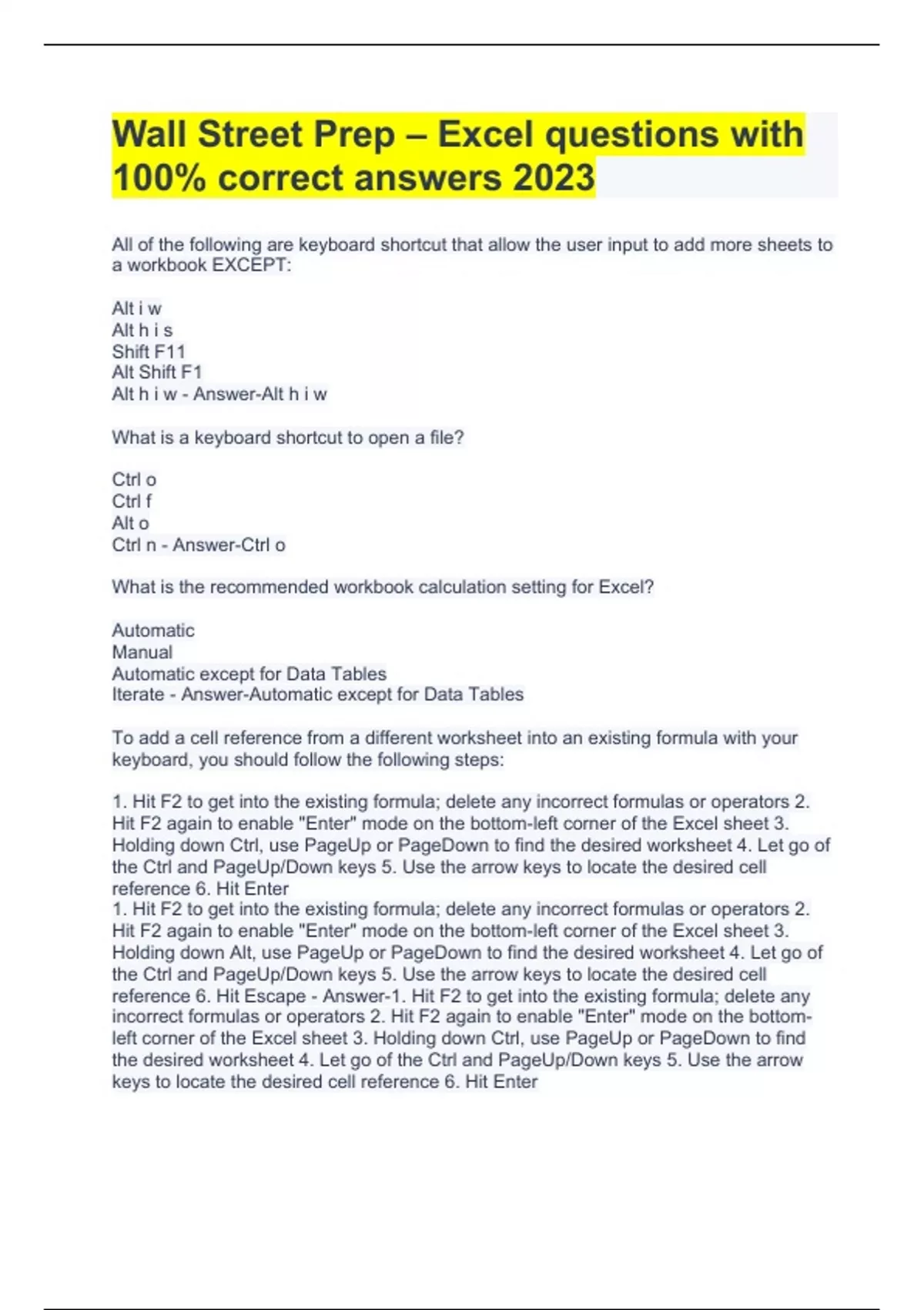 Wall Street Prep – Excel questions with 100% correct answers 2023