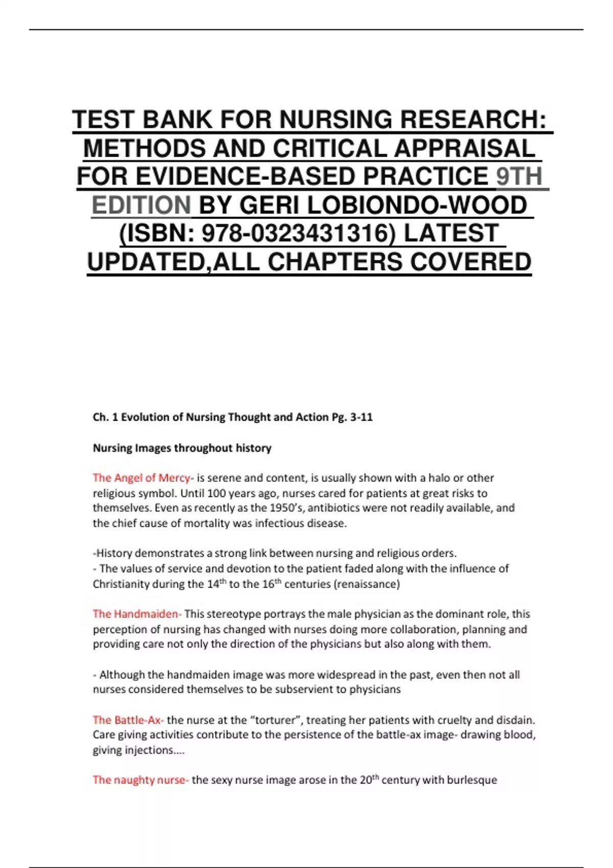 TEST BANK FOR NURSING RESEARCH: METHODS AND CRITICAL APPRAISAL FOR EVIDENCE-BASED PRACTICE 9TH EDITION BY GERI LOBIONDO-WOOD (ISBN: 978-0323431316) LATEST UPDATED,ALL CHAPTERS COVERED