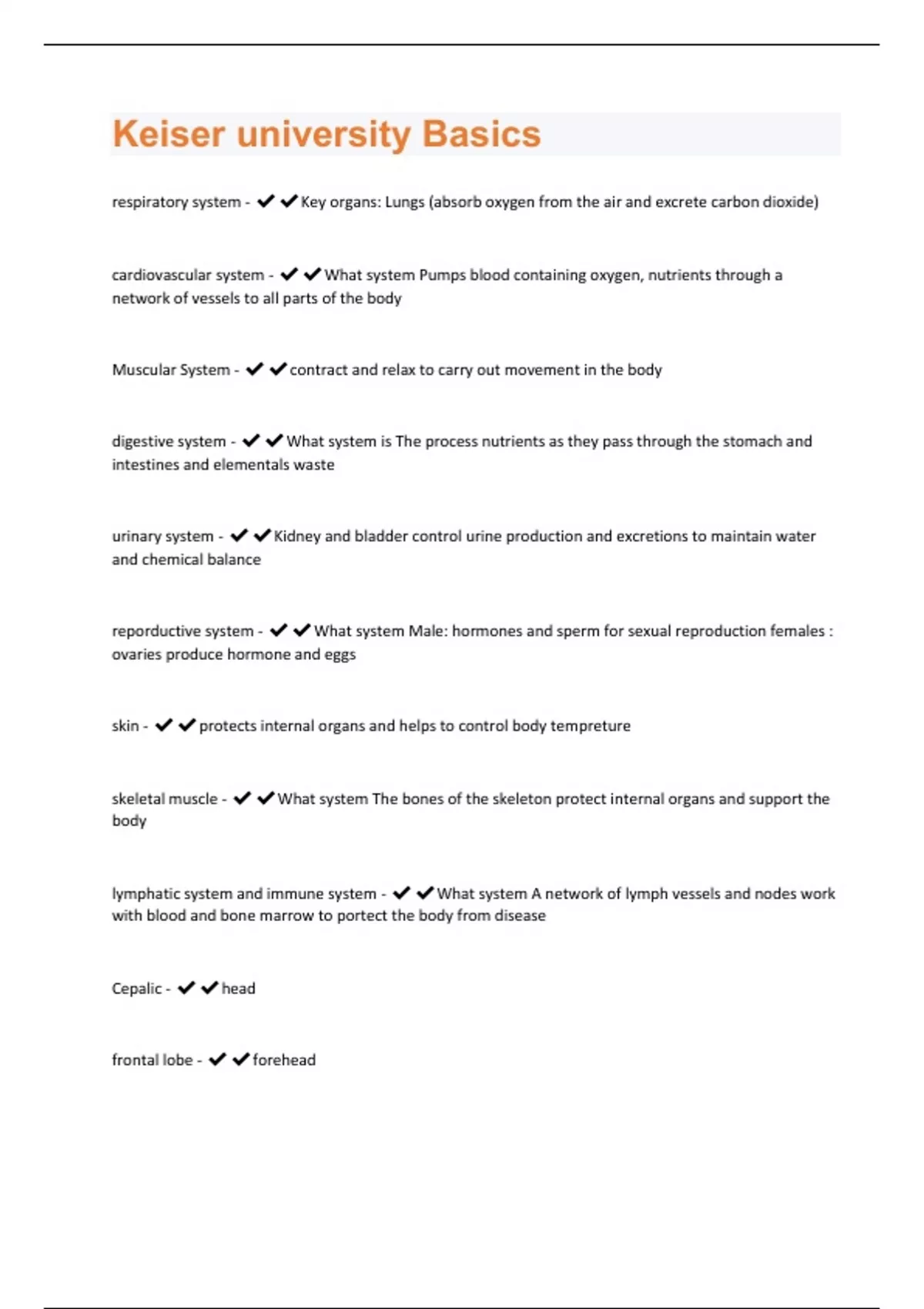 respiratory system - Key organs: Lungs (absorb oxygen from the air and excrete carbon dioxide) cardiovascular system - What system Pumps blood containing oxygen, nutrients through a network of vessels to all parts of the body Muscular System - contract and relax to carry out movement in the body digestive system - What system is The process nutrients as they pass through the stomach and intestines and elementals waste urinary system - Kidney and bladder control urine production and excretions to maintain water and chemical balance reporductive system - What system Male: hormones and sperm for sexual reproduction females : ovaries produce hormone and eggs skin - protects internal organs and helps to control body tempreture skeletal muscle - What system The bones of the skeleton protect internal organs and support the body lymphatic system and immune system - What system A network of lymph vessels and nodes work with blood and bone marrow to portect the body from disease Cepalic - head frontal lobe - foreheadtemporal lobe - Temple Orbital - Eye Otic - ear Buccal - cheek