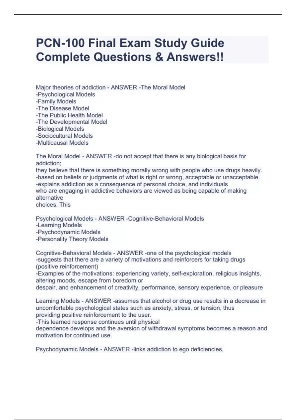 Major theories of addiction - ANSWER -The Moral Model -Psychological Models -Family Models -The Disease Model -The Public Health Model -The Developmental Model -Biological Models -Sociocultural Models -Multicausal Models The Moral Model - ANSWER -do not accept that there is any biological basis for addiction; they believe that there is something morally wrong with people who use drugs heavily. -based on beliefs or judgments of what is right or wrong, acceptable or unacceptable. -explains addiction as a consequence of personal choice, and individuals who are engaging in addictive behaviors are viewed as being capable of making alternative choices. This Psychological Models - ANSWER -Cognitive-Behavioral Models -Learning Models -Psychodynamic Models -Personality Theory Models Cognitive-Behavioral Models - ANSWER -one of the psychological models -suggests that there are a variety of motivations and reinforcers for taking drugs (positive reinforcement) -Examples of the motivations: experiencing variety, self-exploration, religious insights, altering moods, escape from boredom or despair, and enhancement of creativity, performance, sensory experience, or pleasure Learning Models - ANSWER -assumes that alcohol or drug use results in a decrease in uncomfortable psychological states such as anxiety, stress, or tension, thus providing positive reinforcement to the user. -This learned response continues until physical dependence develops and the aversion of withdrawal symptoms becomes a reason and motivation for continued use. Psychodynamic Models - ANSWER -links addiction to ego deficiencies, inadequate parenting, attachment disorders, hostility, homosexuality, masturbation, and so on -A major problem with psychodynamic models is that the difficulties linked to early childhood development are not specific to alcoholism or addiction, but are reported by nonaddicted adults with a variety of other psychological problems -Explanation of addiction: Substance abuse can be viewed as symptomatic of more basic psychopathology. 2. Difficulty with an individual's regulation of affect can be seen as a core problem or difficulty. 3. Disturbed object relations may be central to the development of substance abuse. Personality Theory Models - ANSWER -the assumption that certain personality traits predispose the individual to drug use -"alcoholic personality": dependent, immature, impulsive, highly emotional, having low frustration tolerance, unable to express anger, and confused about their sex role orientation Criticism -Not consistently supported -The consensus among those who work in the addictions counseling arena seems to be that personality traits are not of much importance in explaining addiction because an individual can become drug dependent irrespective of personality traits Family Models - ANSWER -Behavioral Models -Family Systems -Family Disease Behavioral Models - ANSWER -within the context of the family, there is a member