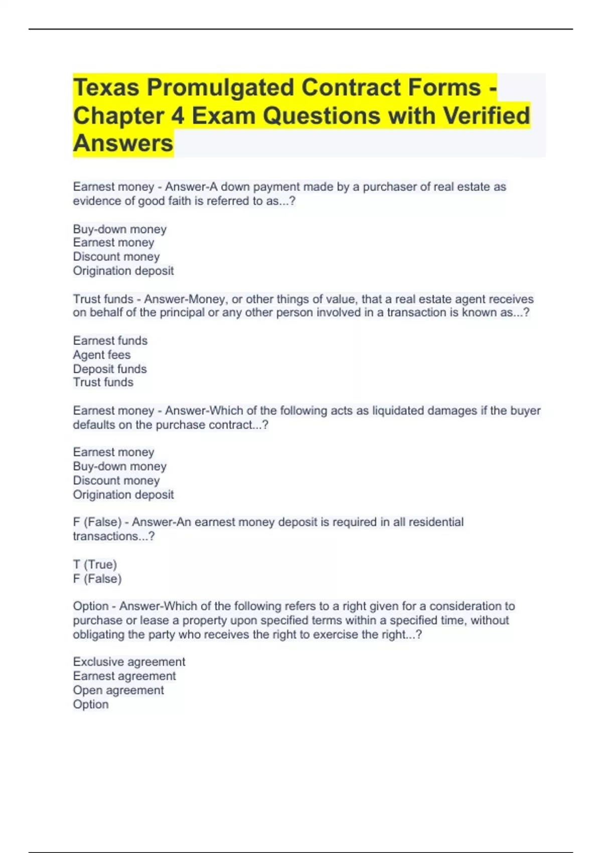 F (False) - Answer-An earnest money deposit is required in all residential