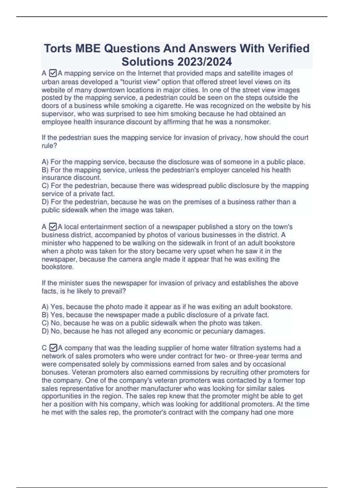 Torts MBE Questions And Answers With Verified Solutions 2023/2024