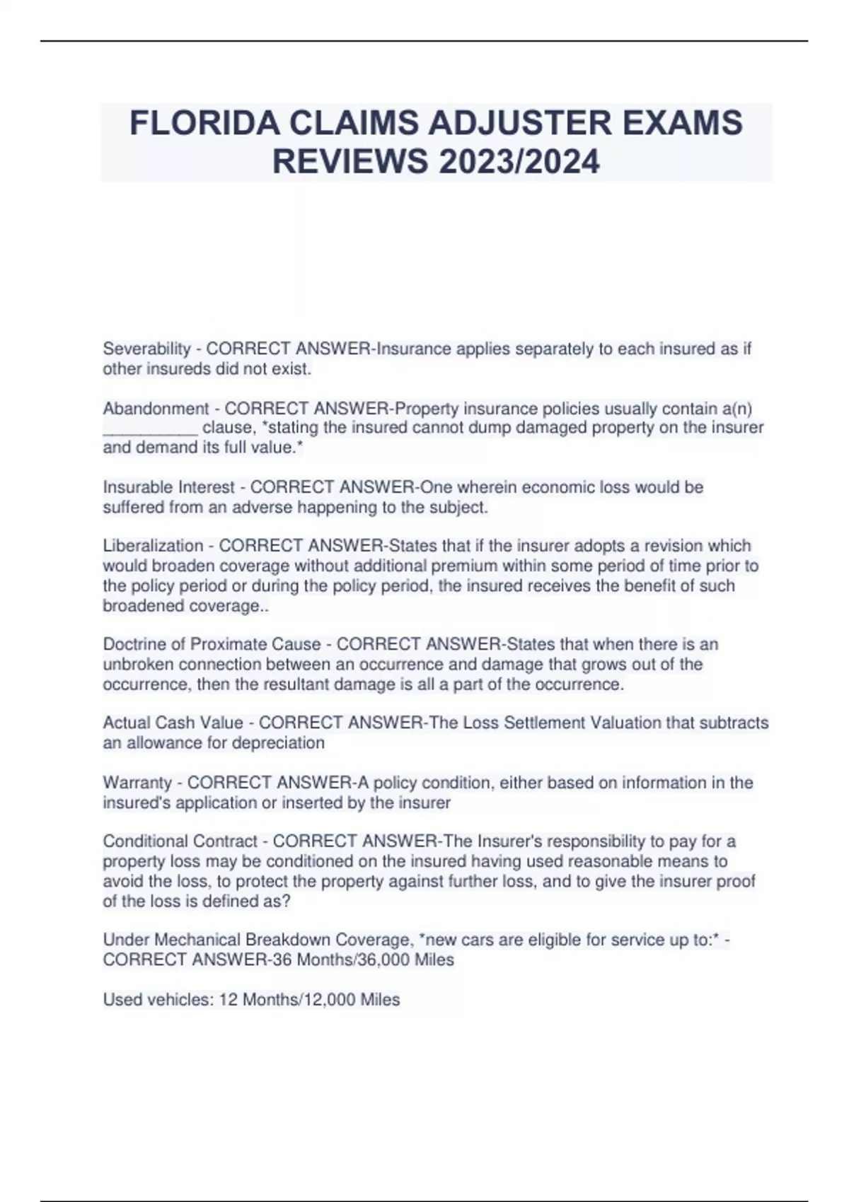 FLORIDA CLAIMS ADJUSTER EXAMS REVIEWS 2023/2024 Severability - CORRECT ANSWER-Insurance applies separately to each insured as if other insureds did not exist. Abandonment - CORRECT ANSWER-Property insurance policies usually contain a(n) __________ clause, *stating the insured cannot dump damaged property on the insurer and demand its full value.* Insurable Interest - CORRECT ANSWER-One wherein economic loss would be suffered from an adverse happening to the subject. Liberalization - CORRECT ANSWER-States that if the insurer adopts a revision which would broaden coverage without additional premium within some period of time prior to the policy period or during the policy period, the insured receives the benefit of such broadened coverage.. Doctrine of Proximate Cause - CORRECT ANSWER-States that when there is an unbroken connection between an occurrence and damage that grows out of the occurrence, then the resultant damage is all a part of the occurrence. Actual Cash Value - CORRECT ANSWER-The Loss Settlement Valuation that subtracts an allowance for depreciation Warranty - CORRECT ANSWER-A policy condition, either based on information in the insured's application or inserted by the insurer Conditional Contract - CORRECT ANSWER-The Insurer's responsibility to pay for a property loss may be conditioned on the insured having used reasonable means to avoid the loss, to protect the property against further loss, and to give the insurer proof of the loss is defined as? Under Mechanical Breakdown Coverage, *new cars are eligible for service up to:* - CORRECT ANSWER-36 Months/36,000 Miles Used vehicles: 12 Months/12,000 Miles If financial responsibility doesn't exist at the time of an accident, what happens? - CORRECT ANSWER-The legally valid claims of others must be satisfied (10/20/10) The owner and operator must provide certification of future responsibility for future accidents As to required proof for future accidents by purchase of auto liability insurance, the insurer must make a filing (Form SR-22) certifying that coverage is in effect, and this certification must remain on file for __________ years - CORRECT ANSWER-3 The Business Automobile Policy includes all of the following coverage forms except: - CORRECT ANSWER-The Trailer Interchange Coverage Form Personal Injury Protection, or PIP, has a __________ per person, per accident limit. - CORRECT ANSWER-10,000 Used to insure businesses engaged in selling, servicing, repairing, parking or storing automobiles: - CORRECT ANSWER-Garage Coverage Form The following examples are referred to as __________ liability limits: 25/50/25 or 10/20/10. - CORRECT ANSWER-Split 10/20/10 = 10,000 per person injured 20,000 all injuries combined 10,000 property damage Example of straight liability limit = $30,000 Jeremy has a not at fault accident. If he has PIP with a $1,000 deductible, how much can he expect his PIP coverage to pay toward his medical bills that total $3,000? - CORRECT ANSWER-$1,600 3000 (bills) - 1000 (deductible) = 2000 x .80 (eighty percent) Frank has a not-at-fault accident, he has basic PIP, no deductible and Med pay of $5,000. How much will his Med Pay contribute to medical bills of $15,000? - CORRECT ANSWER-$5,000 Medical Payment limits apply per person; Frank will receive full amount towards medical bills. Which of the following is not one of the rating factors for a Homeowner's Policy? - CORRECT ANSWER-Age & Gender of Insured On a Homeowner's Policy, covers items that are not permanently attached to the dwelling. This is defined as: - CORRECT ANSWER-Other Structures Examples include sheds, fences, pool houses, detached car ports, etc. A lender has an insurable interest in a home and finds protection in the: - CORRECT ANSWER-Mortgagee Clause Mortgagee - Homeowner's policy Loss Payee - Automobile policy Which of the following forms is "all-risk" on the dwelling policy? - CORRECT ANSWERDP-3, or the Special Form When the basic liability limits provided by the policy are insufficient for an insureds needs, two coverage forms are used to provide the additional amounts of coverage: A. Excess Liability B. Umbrella C. Both A & B D. None of the Above - CORRECT ANSWER-Both A & B Which of the following is not covered under Coverage C, Personal Property? A. A fire breaks out in the residence and an overnight guest loses his clothes in the fire B. A fish dies because he has been left alone for a week without food C. The insureds daughters tennis racket is stolen from her locker D. The insureds suitcase and clothing, valued at $1,500, are stolen from his hotel - CORRECT ANSWER-B. A fish dies because he has been left alone for a week without food Animals are listed as an "exclusion" under a Homeowner's policy. All of the following are eligible for a Homeowner's Policy, except? A. An apartment tenant B. A condominium owner C. Four-family dwelling owner-occupant D. A business condo owned by a local insurance company - CORRECT ANSWER-D. A business condo owned by a local insurance company Commercial property is not eligible for a Homeowner's policy. Which of the following are characteristics of Homeowner's Insurance? A. Protects against economic loss to residences and household property and legal liabilities B. Owner-occupants of 1-4 family dwellings C. Renters who maintain residential occupancy in any type of building D. All of the Above - CORRECT ANSWER-D. All of the Above Also included: personal, non-business risk, no more than 2 roomers/boarders, condominium unit owners and cooperative apartment occupants Jeremy owns a home that is recently damaged due to a hurricane. The repair estimate is averaged at $25,000 and Jeremy decides to stay in a hotel because most of the damage is to his bedroom and kitchen. Under a Homeowner's Policy, what coverage will pay for the hotel room bill? A. Fair Rental Value B. Value Obligation C. Loss of Use D. Insurers Duties - CORRECT ANSWER-C. Loss of Use The insurer will pay any necessary and reasonable expenses assoc