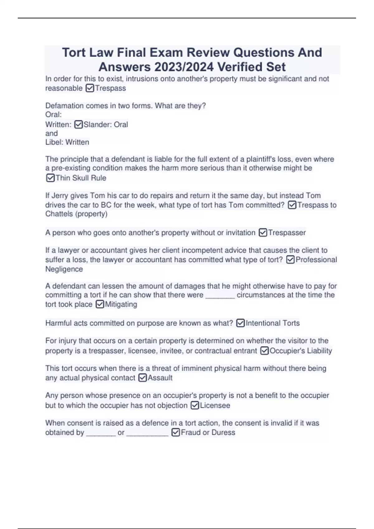 Tort Law Final Exam Review Questions And Answers 2023/2024 Verified Set Tort Law Final Exam Review Questions And Answers 2023/2024 Verified Set