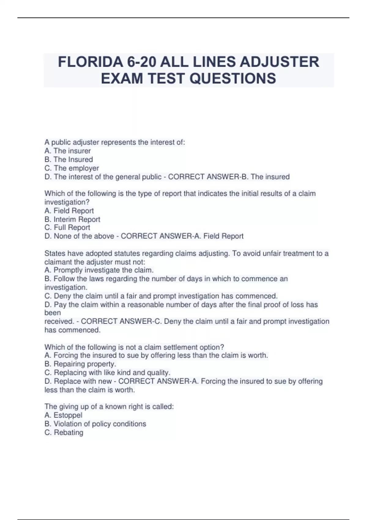 FLORIDA 6-20 ALL LINES ADJUSTER EXAM TEST QUESTIONS A public adjuster represents the interest of: A. The insurer B. The Insured C. The employer D. The interest of the general public - CORRECT ANSWER-B. The insured Which of the following is the type of report that indicates the initial results of a claim investigation? A. Field Report B. Interim Report C. Full Report D. None of the above - CORRECT ANSWER-A. Field Report States have adopted statutes regarding claims adjusting. To avoid unfair treatment to a claimant the adjuster must not: A. Promptly investigate the claim. B. Follow the laws regarding the number of days in which to commence an investigation. C. Deny the claim until a fair and prompt investigation has commenced. D. Pay the claim within a reasonable number of days after the final proof of loss has been received. - CORRECT ANSWER-C. Deny the claim until a fair and prompt investigation has commenced. Which of the following is not a claim settlement option? A. Forcing the insured to sue by offering less than the claim is worth. B. Repairing property. C. Replacing with like kind and quality. D. Replace with new - CORRECT ANSWER-A. Forcing the insured to sue by offering less than the claim is worth. The giving up of a known right is called: A. Estoppel B. Violation of policy conditions C. Rebating D. Waiver - CORRECT ANSWER-D. Waiver An innocent party relies on certain statements made by the adjuster and is damaged as a result. The guilty party may be legally prohibited from asserting that the fact does not exist because of: A. Waiver B. Estoppel C. Duties of the adjuster D. Law of contract - CORRECT ANSWER-B. Estoppel Should an insured fail to report a claim in a timely fashion the adjuster will usually: A. Deny the claim. B. Send the insured a reservation of rights letter. C. Cease investigating. D. Seek the advice of the company's attorney. - CORRECT ANSWER-B. Send the insured a reservation of rights letter. A company adjuster primarily represents the interests of: A. The insured. B. The claimant. C. The insurer. D. The public. - CORRECT ANSWER-C. The insurer. An adjuster's license will usually be revoked for which of the following reasons: A. Denying claims that are not covered. B. Failing to report a change of address. C. Having been convicted of a misdemeanor. D. Having been convicted of a felony. - CORRECT ANSWER-D. Having been convicted of a felony. The insured has been involved in an automobile accident and has sustained bodily injuries and damage to the insured vehicle. The adjuster will usually: A. Withhold any payment until all the bills have been reviewed for payment. B. Pay to repair the vehicle and pay the medical bills later. C. Pay for the repair of the vehicle and require a release for all claims. D. Pay to repair the damage to the vehicle and obtain a partial release and settle the medical payments later and then seek a final release. - CORRECT ANSWER-D. Pay to repair the damage to the vehicle and obtain a partial release and settle the medical payments later and then seek a final release. Mr. Jones has damaged his vehicle by striking a tree. He can: A. Take the car to a repair garage recommended by the insurer. B. Take the car to a garage of his/her choice. C. Accept the payment based on the adjuster's estimate. D. All of the above. - CORRECT ANSWER-D. All of the above. In case of a total loss to a vehicle the adjuster will pay the insured/claimant which of the following? A. The cost to replace the vehicle with like kind and quality if a current year model. B. Use the most recent publication of an "Official Used Car Guide". C. If not listed in the "guide", obtain quotations from automobile dealers. D. All of the above depending on the circumstances. - CORRECT ANSWER-D. All of the above depending on the circumstances. Which of the following is NOT a claim settlement option for liability claims? A. Lost wages B. Excessive amounts claimed C. Loss of use D. Disfigurement - CORRECT ANSWER-B. Excessive amounts claimed Which of the following results in immediate payment when the claimant signs a release relinquishing his or her right to sue? A. Scheduled Payment Release B. Full Release Settlement C. Advanced Payment D. Structured Settlement - CORRECT ANSWER-B. Full Release Settlement Which of the following relieves the financial burden on the claimant by making certain payments to the claimant even before the claim can be negotiated? A. No Release or Walk-Away B. Rehabilitation C. Advanced Payment D. Open-Ended Release - CORRECT ANSWER-C. Advanced Payment Which of the following statements is correct? I. The Business Auto Policy uses 10 symbols to define covered vehicles II. Symbols 30 and 31 apply to the Garage Policy. A. I only. B. II only. C. Neither I nor II. D. Both I and II. - CORRECT ANSWER-D. Both I and II. Which of the following is not a Business Auto endorsement? A. Drive Other Car. B. Change Other Driver. C. Individual Named Insured. D. Mobile Equipment. - CORRECT ANSWER-B. Change Other Driver. Under the Business Auto Policy, each of the following is true about classification of "covered autos," except: A. "Any auto" is the broadest coverage classification. B. An insured may select different classifications for different coverages. C. All classes of newly acquired autos are automatically covered. D. "Hired autos" includes autos the insured leases, hires, rents or borrows. - CORRECT ANSWER-C. All classes of newly acquired autos are automatically covered. According to the Business Auto definitions, an "accident": A. Includes continuous or repeated exposure to the same conditions. B. Must be sudden and unexpected. C. Must be unexpected and unpreventable. D. Is any event that causes injury or damage. - CORRECT ANSWER-A. Includes continuous or repeated exposure to the same conditions. Joseph Young, who is insured under a Business Auto policy, is involved in an accident. He and the insurance company disagree on the amount to be paid for the damage to his car. Und