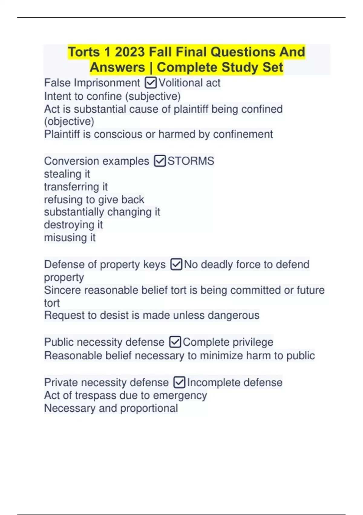 Torts 1 2023 Fall Final Questions And Answers | Complete Study Set Torts 1 2023 Fall Final Questions And Answers | Complete Study Set
